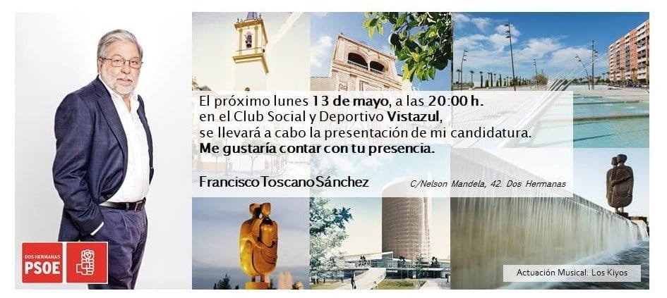 En el marco de la Campaña de las Elecciones Municipales, el próximo lunes, día 13, el PSOE presentará su candidatura. Será a las 20:00 horas en el Club Social y Deportivo Vistazul. El evento contará con la actuación musical de Los Kiyos.