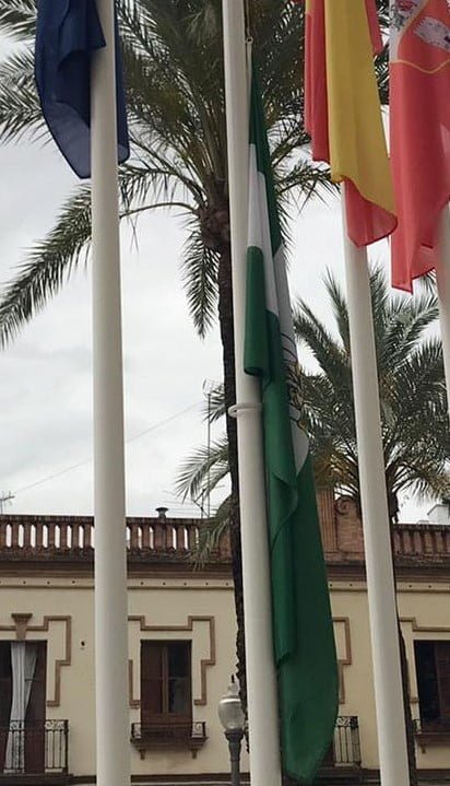 La bandera de Andalucía del Ayuntamiento de Dos Hermanas ondea a media asta con motivo del luto oficial decretado por la Junta de Andalucía en recuerdo de las víctimas mortales del Coronavirus.