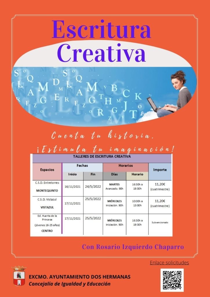 Además, el día 18 de noviembre vuelven los Talleres de Escritura Creativa con nuevos contenidos y propuestas. Desde 2013, alumnas muy diversas han pasado por estos talleres demostrando su capacidad para imaginar y compartir. Ahora, tras la pandemia, se vuelven a abrir esas puertas creativas a las mujeres nazarenas. Se imparte en el A.S.D. Entretorres (Montequinto), martes de 16:30 a 19:30 horas, y C.S.D. Vistazul, los miércoles de 10:00 a 13:00 horas. Plazas limitadas.