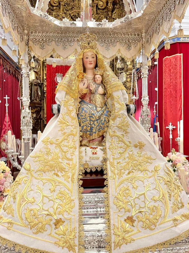 Luce el manto blanco bordado en oro en 1973, estrenado por la coronación, realizado por las Hermanas Adoratrices de Sevilla y donado por Francisco Gómez Carballido y Teresa Alonso Rivas.