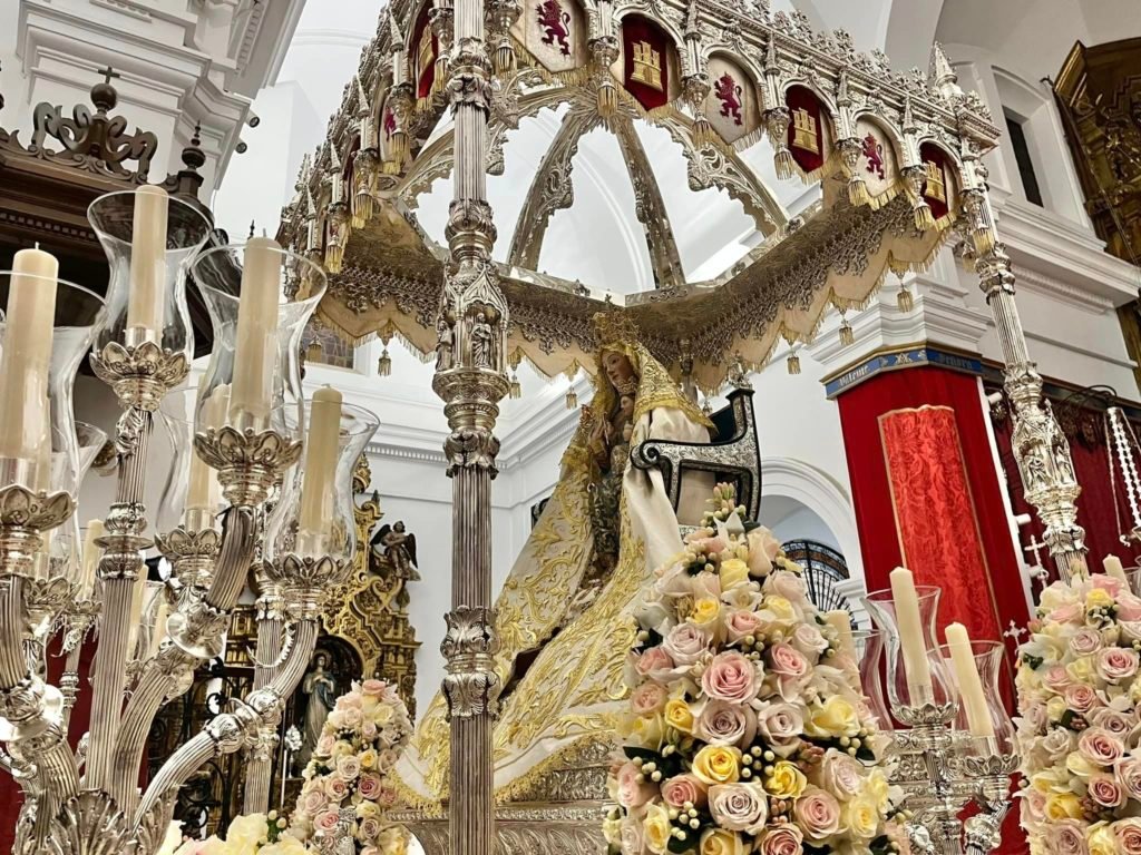 El nuevo templete que estrena la Virgen de Valme para este 50 aniversario de la coronación ha sido proyectado por el diseñador Javier Sánchez de los Reyes y ejecutado por el Taller de Orfebrería Juan Lozano y el Taller de Bordados Santa Clara