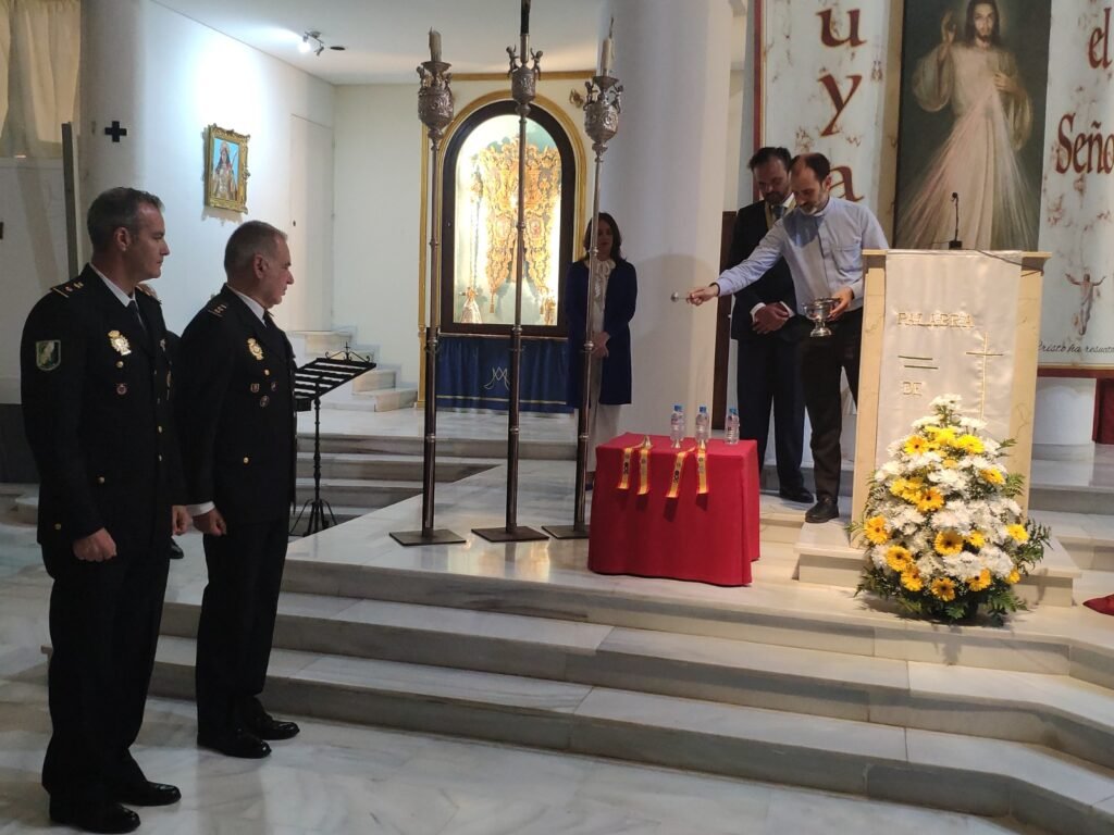 El comisario, Francisco Javier Vidal Delgado-Roig, y el que fuera Inspector Jefe, Luis Villaverde, de la comisaria nazarena estuvieron presentes durante la bendición por parte del párroco Francisco Javier Nadal Villacreces. El comisario se acordó durante su intervención del Guardia Civil de Dos Hermanas fallecido en acto de servicio en Madrid, José Antonio Rosa Alcocer, afirmando que «cada vez que suenen esas campanitas será como una oración y la primera, un día como hoy y con mucho sentimiento, tienen que ser por él y por toda su familia». Y que cada vez que suenen en la romería, añadió, Francisco Javier, «pedirle a la Reina de las Marismas que ruegue por España, por la Policía Nacional, por la Hermandad de Montequinto y por Dos Hermanas«.