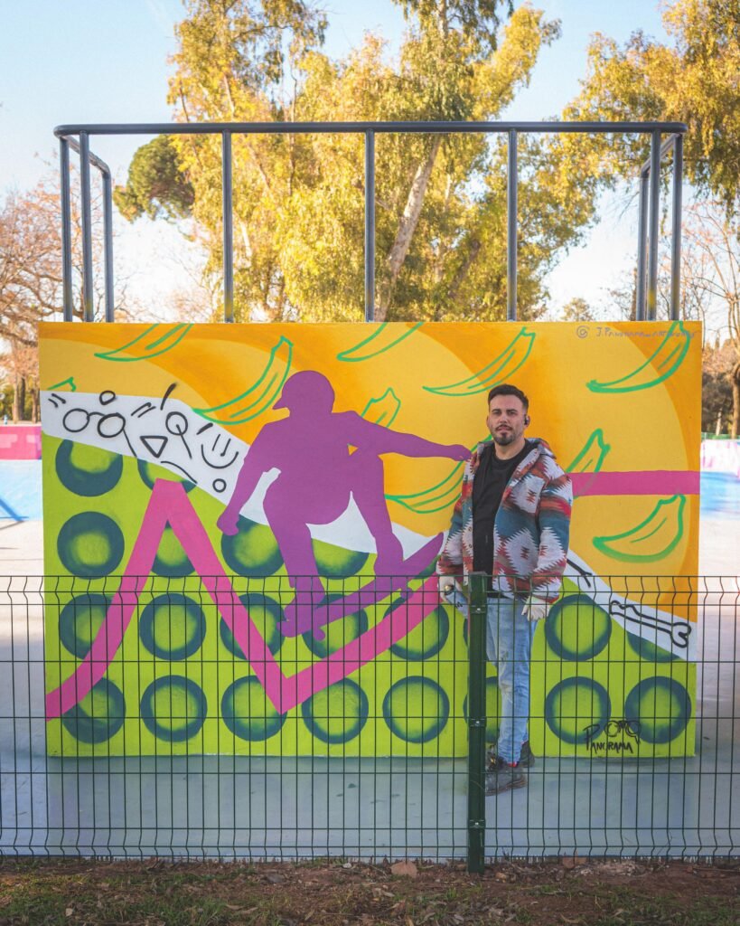 Tras la intervención que ha llevado a cabo el Ayuntamiento de Dos Hermanas en estas instalaciones, pintando las pistas, debido a su estado de deterioro, Diego se ha encargado de realizar un mural en las paredes traseras y laterales del skate park. Antes de esta restauración, explica el artista, “ya había realizado un mural y ahora lo que he hecho es una versión mejorada”.