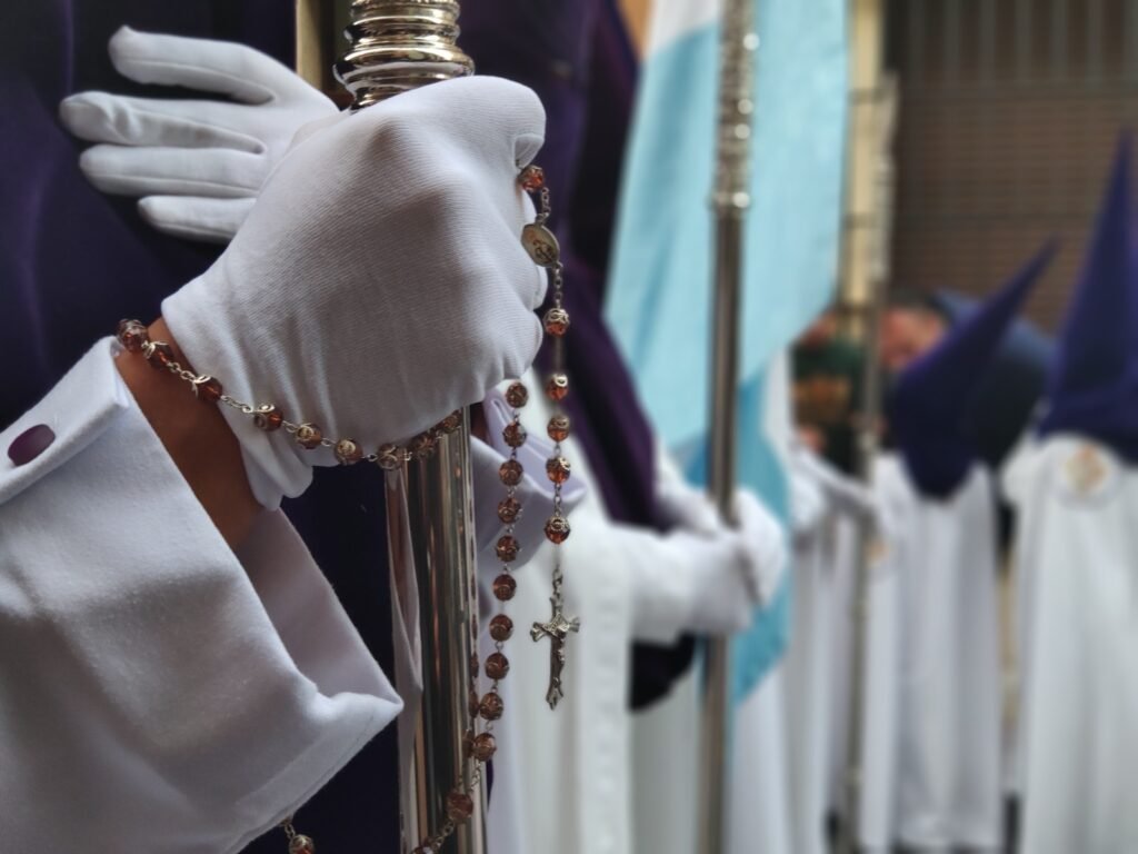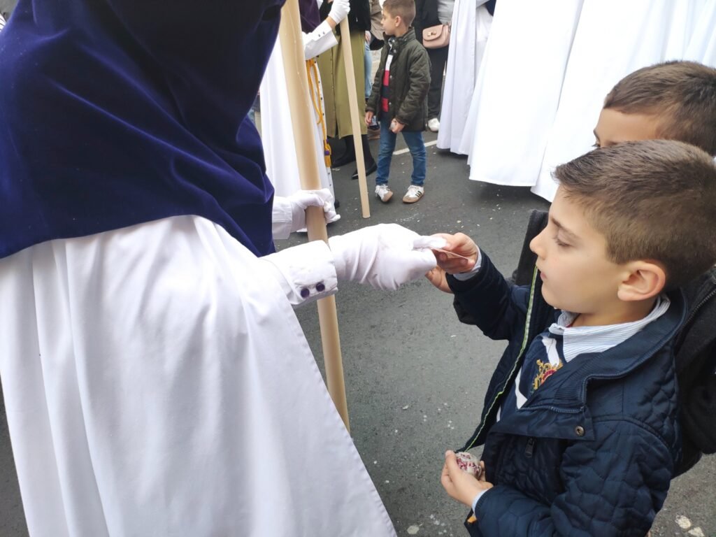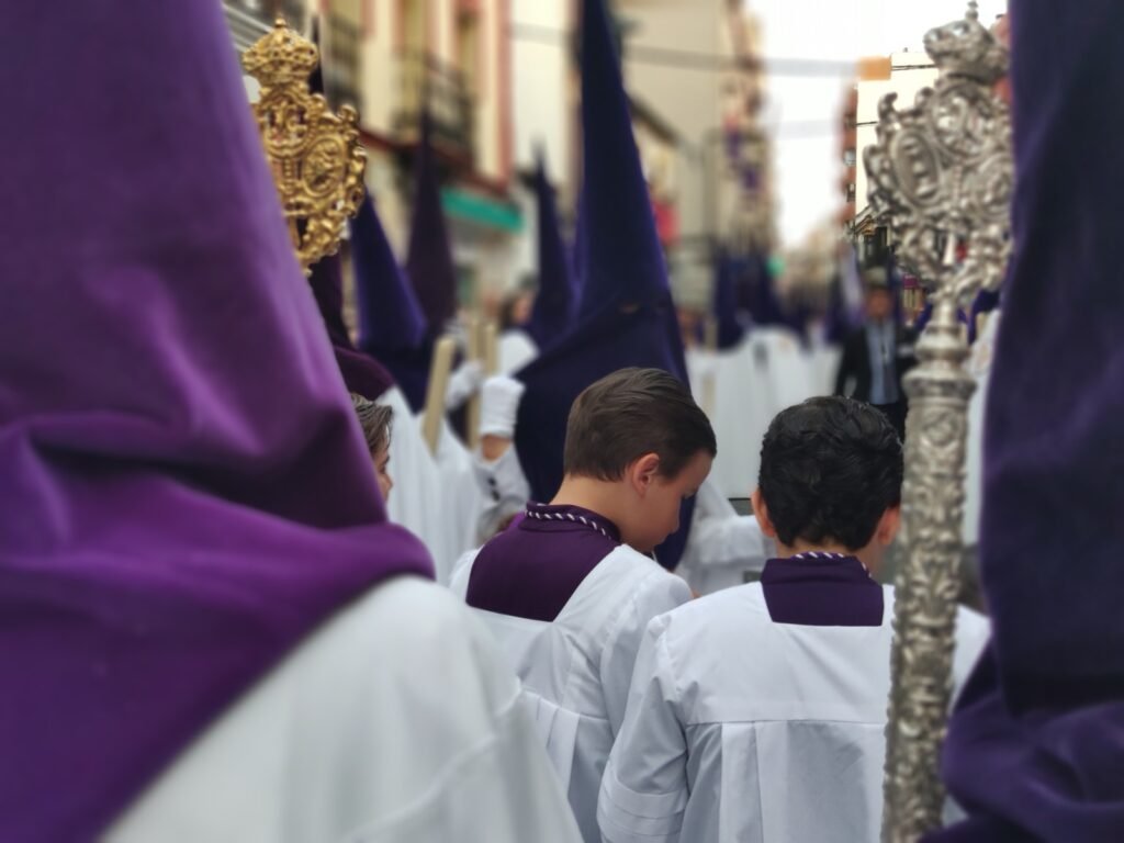En este Miércoles de puentes entre estreno y tradicion, el toque clásico de la jornada lo puso la Hermandad de Oración. Tras un año de ausencia por la lluvia, el nerviosismo en la calle Aníbal González era grande cuando a las 19:00 horas se abrieron las puertas de la casa hermandad y los primeros nazarenos de túnica de capa blanca y antifaz morado se encontraban con una tarde desapacible, con viento e, incluso, algunas gotas de lluvia. La Banda de Cornetas y Tambores Esperanza de Ciudad Rodrigo fue abriendo paso con sus sones a la cruz de guía.