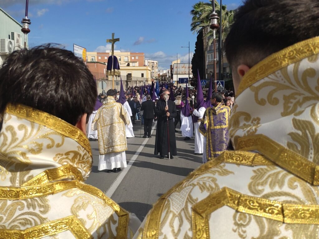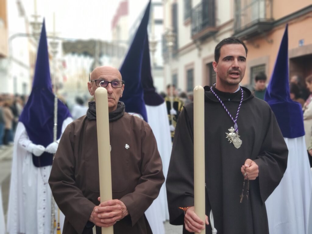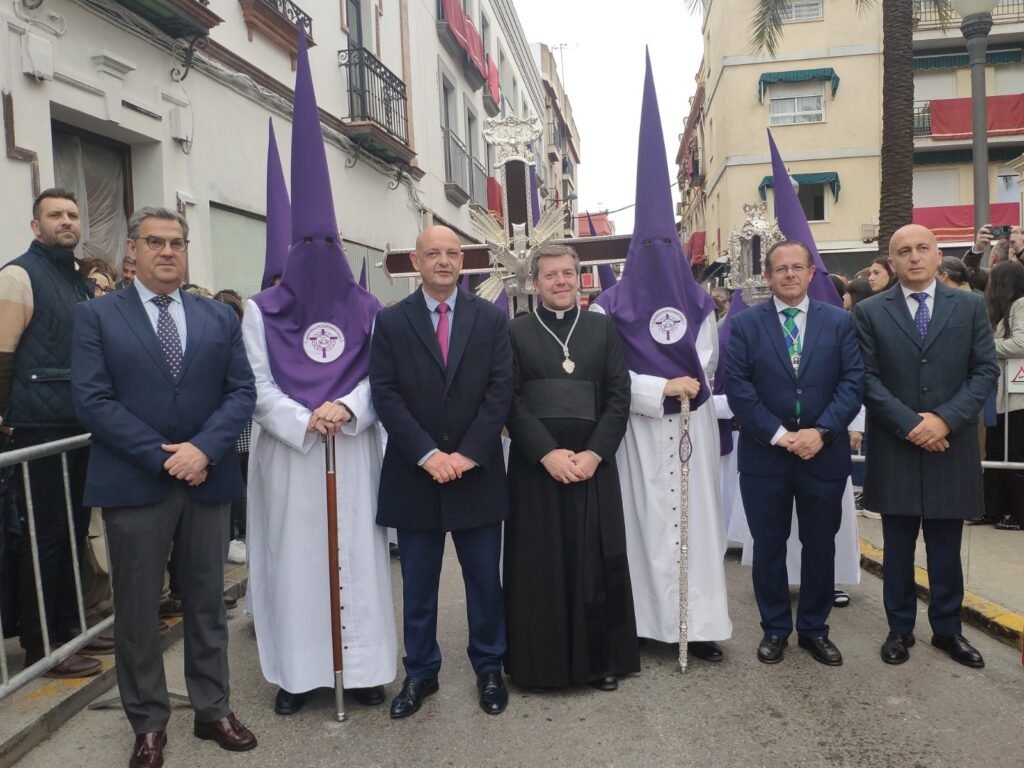 En la delentaera del paso, el párroco de San José, Leonardo Giacosa, que estuvo acompañado en esta estación de penitencia por Gregorio Sillero, el que fuera párroco de Ntra. Sra. de la Oliva y que tuvo un papel importante en la evolución de esta agrupación de fieles. Además, en el cortejo procesionó una representación, con sus simpecados, de las hermandades de Presentación al Pueblo y Amargura, madrinas del Cristo y la Virgen de esta nueva cofradía, así como de la Agrupación del Dulce Nombre, con la que compartieron años en La Oliva. Y, entre sus enseres destacados, el estreno del libro de regla que también procesionaba por primera vez en esta jornada para la historia.