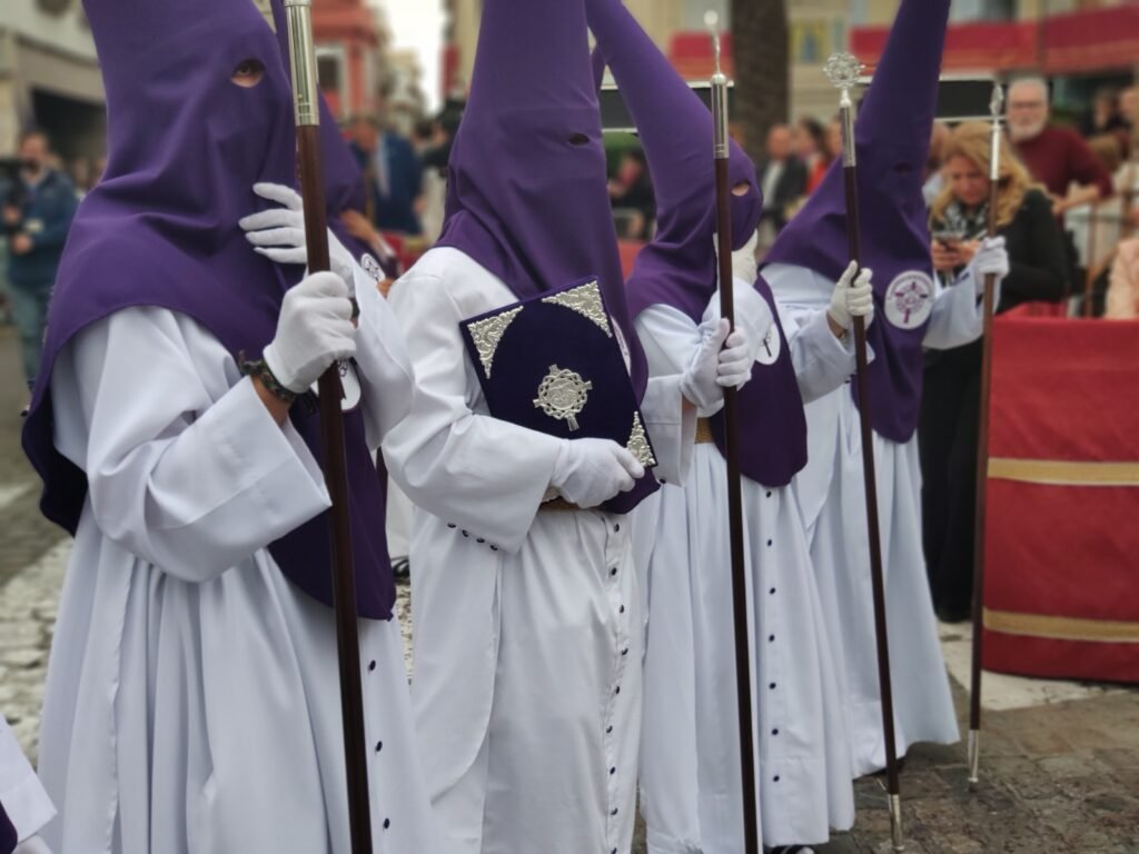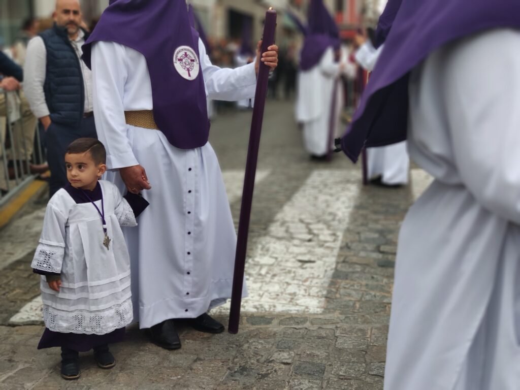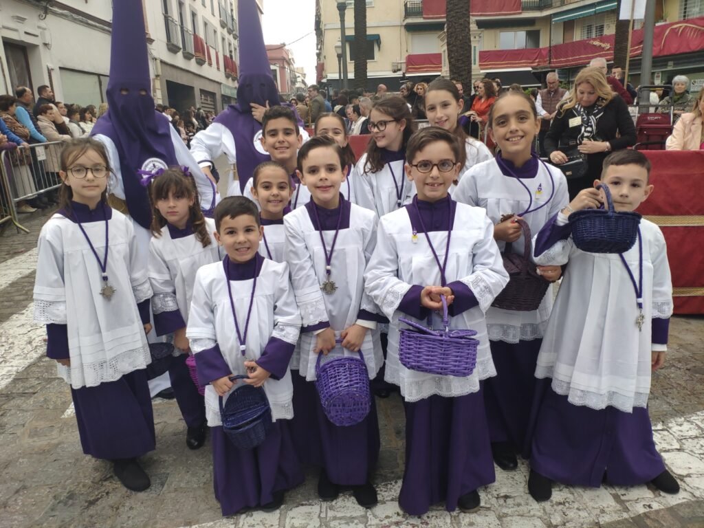 La jornada comenzaba más temprano de la habitual, pasada las cuatro de la tarde, cuando se ponía en la calle desde la Parroquia de San José, entre dos barrios, La Moneda y Las Infantas, la cofradía de las Tres Caídas. Por primera vez en su historia, los nazarenos de túnica blanca de cola y antifaz morado cruzaron el dintel de este templo en el estreno como cofradía de penitencia en la Semana Santa nazarena de la agrupación parroquial con más historia y recorrido de la ciudad.