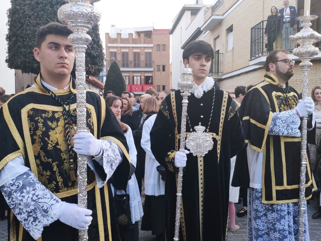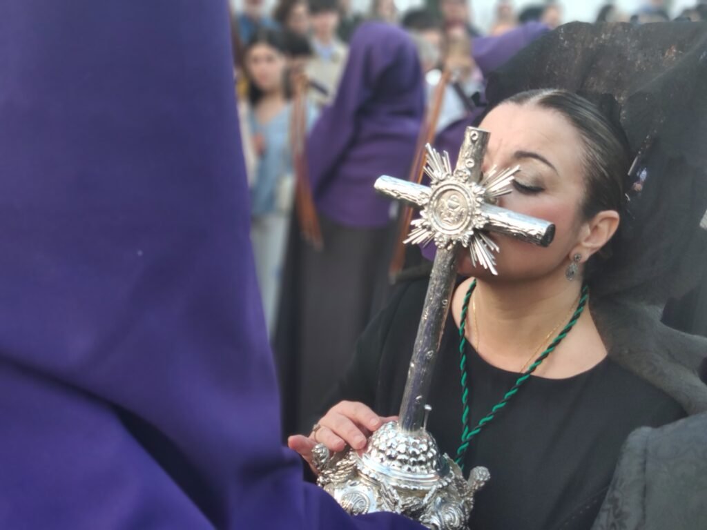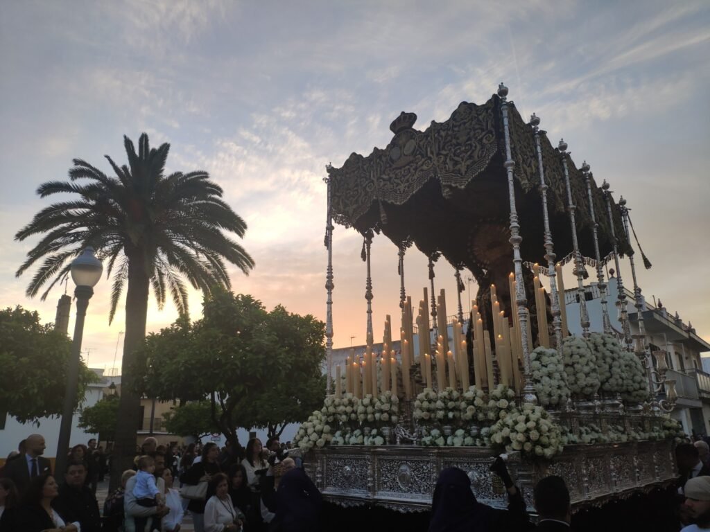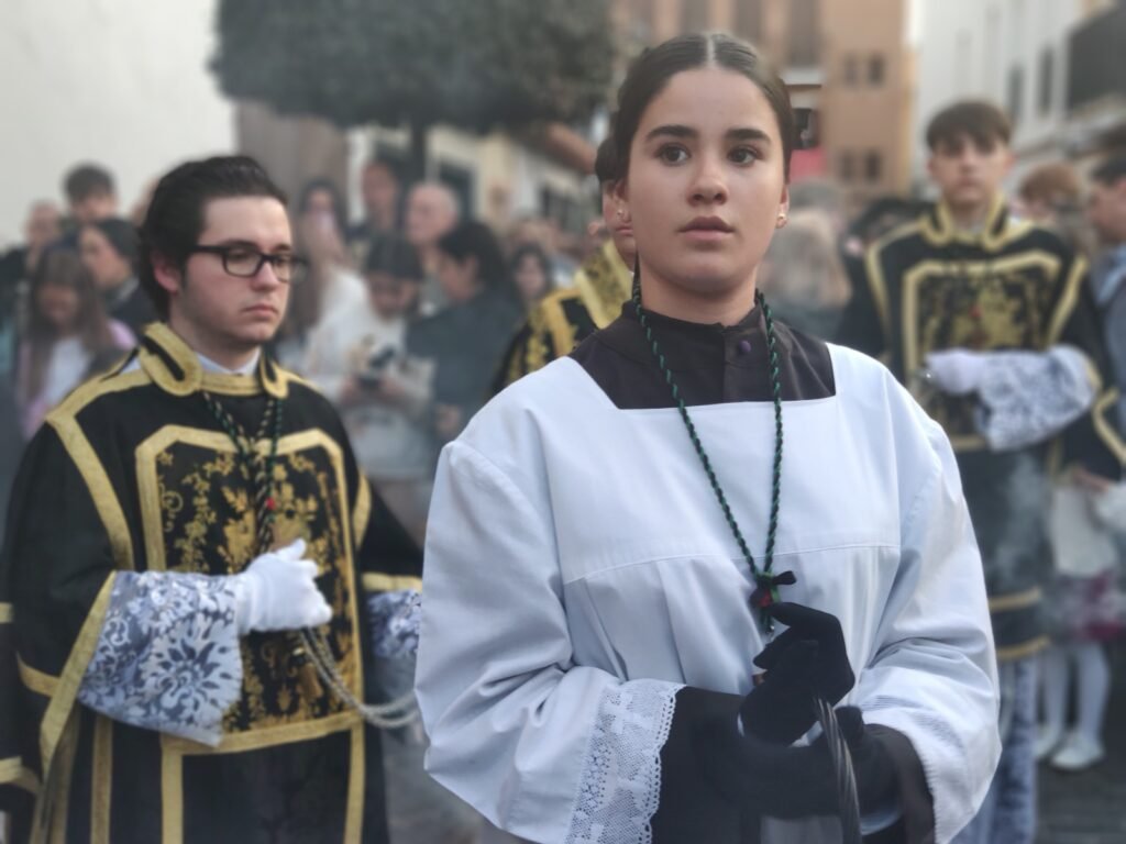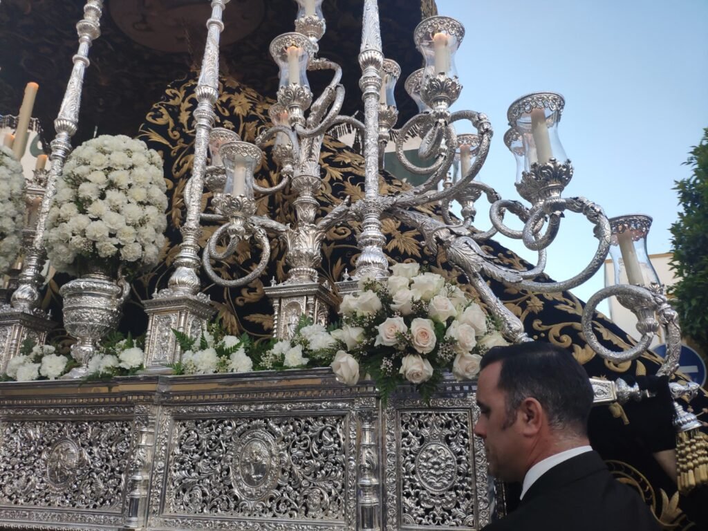 Sobriedad, silencio y respeto del público al paso de Cristo muerto en la cruz al iniciar su caminar y adentrarse en la Plaza Hidalgo Carret para iniciar su estación de penitencia. Tras el hijo, en su Mayor Dolor, la Virgen, bajo su palio de terciopelo color azul oscuro, bordado en oro, tanto en su interior como en el exterior con abundante decoración vegetal. Con un elegante y sencillo exorno floral blanco a base de claveles y rosas, esta dolorosa de autoría anónima, procesiona cada Jueves Santo escolatada por dos lemas en el interior de sus bambalines delantera y trasera: «Regina un caelun asumpta’ y ‘Regina sine labe concepta’.