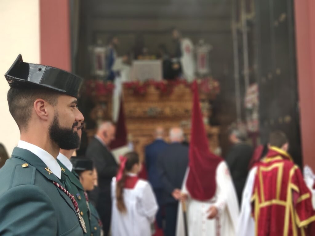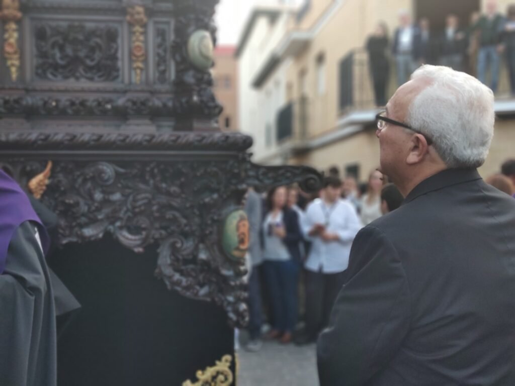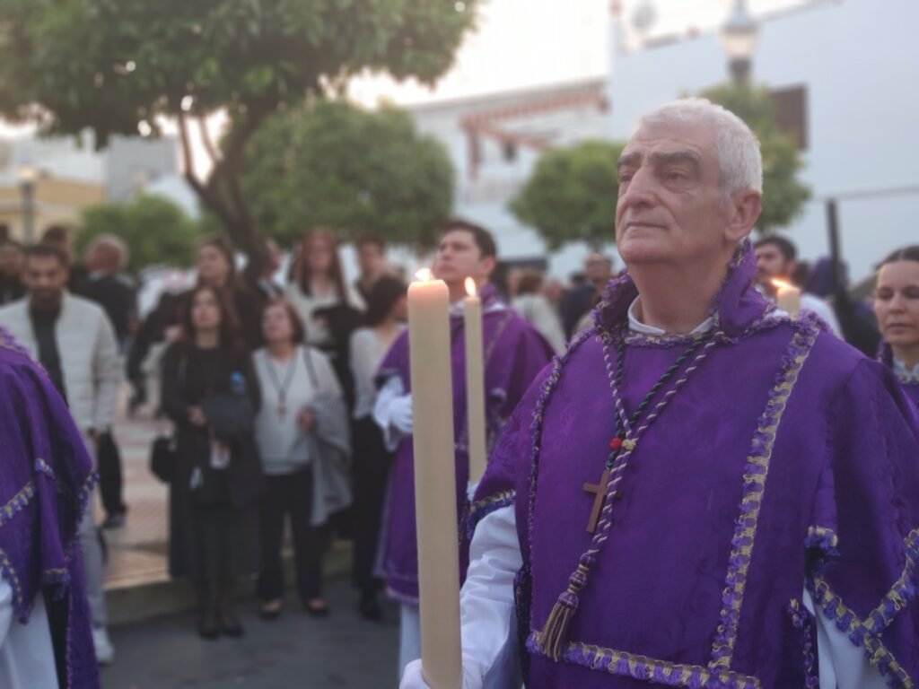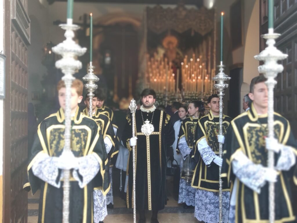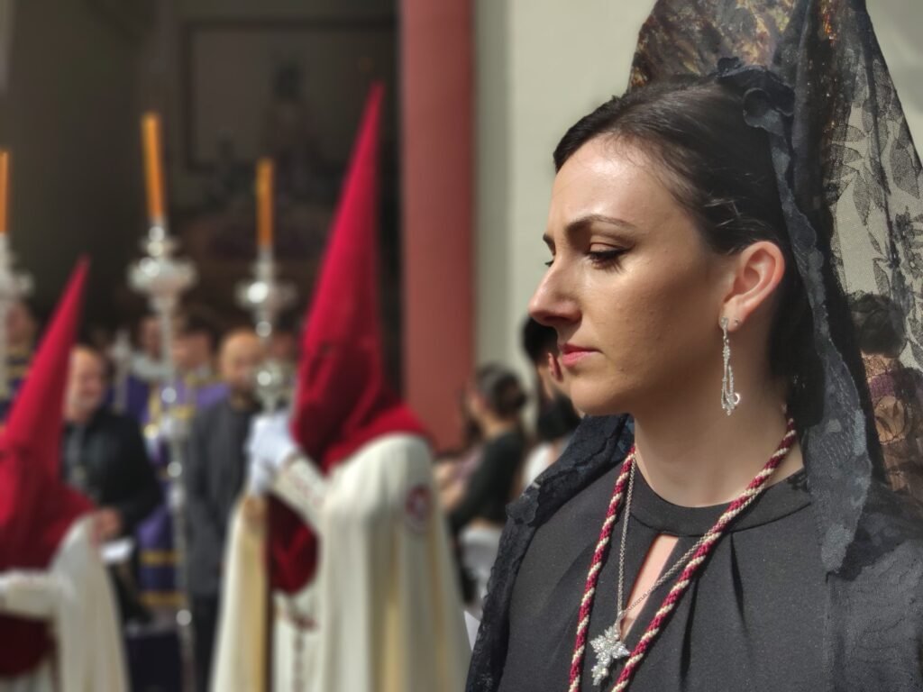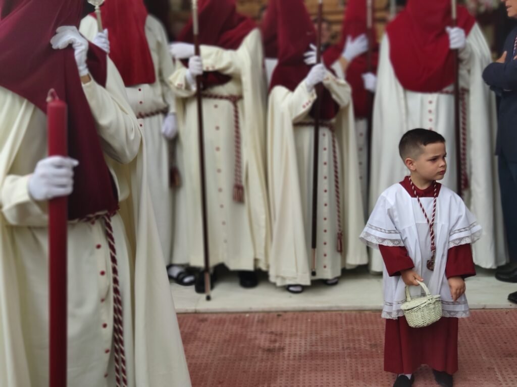 Sobriedad, silencio y respeto del público al paso de Cristo muerto en la cruz al iniciar su caminar y adentrarse en la Plaza Hidalgo Carret para iniciar su estación de penitencia. Tras el hijo, en su Mayor Dolor, la Virgen, bajo su palio de terciopelo color azul oscuro, bordado en oro, tanto en su interior como en el exterior con abundante decoración vegetal. Con un elegante y sencillo exorno floral blanco a base de claveles y rosas, esta dolorosa de autoría anónima, procesiona cada Jueves Santo escolatada por dos lemas en el interior de sus bambalines delantera y trasera: «Regina un caelun asumpta’ y ‘Regina sine labe concepta’.