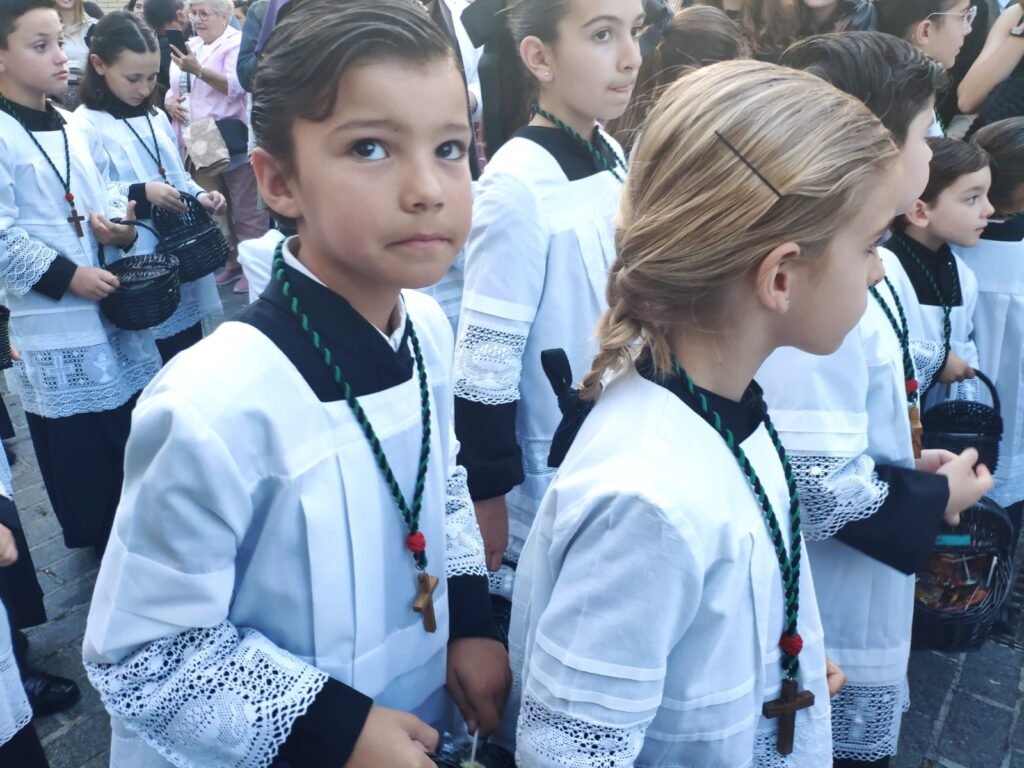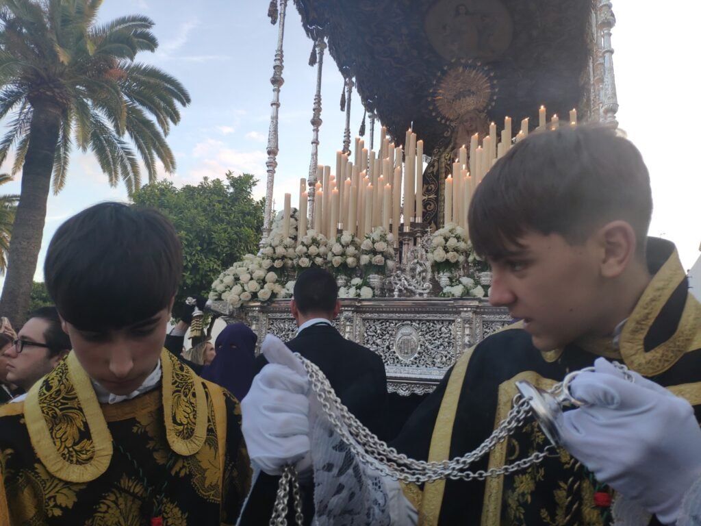 En el cortejo que presedía a Nuestra Señora del Amparo y Esperanza se incorporaba este 2025 la insignia de la Bandera Concepcionista, que la hermandad recuperaba este año y que abrió uno de los tramos de palio. La Virgen lucía un colorista exorno floral y estrenaba en su mano un rosario de filigrana que había sido realizado con perlas cultivadas y chapado en plata, donado por Valme Avilés Jurado, una de las camareras de la Virgen.