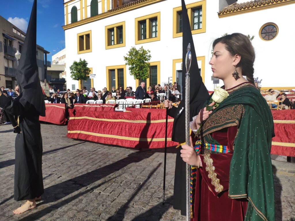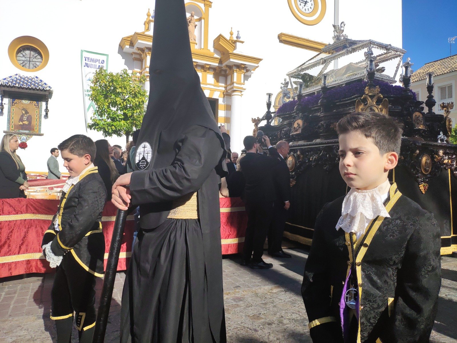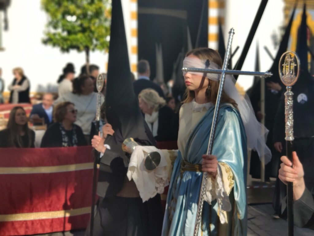Tras la apertura del templo, el tañir del muñidor, acompañado por los servidores que preceden a la cruz de guía de la hermandad, fue abriendo paso al cuerpo de nazarenos. Entre ellos, la representación de las Virtudes Teologales ( Fe, Esperanza y Caridad), la santa mujer Verónica y las Tres Marías (María Magdalena, María Cleofás y María Salomé).