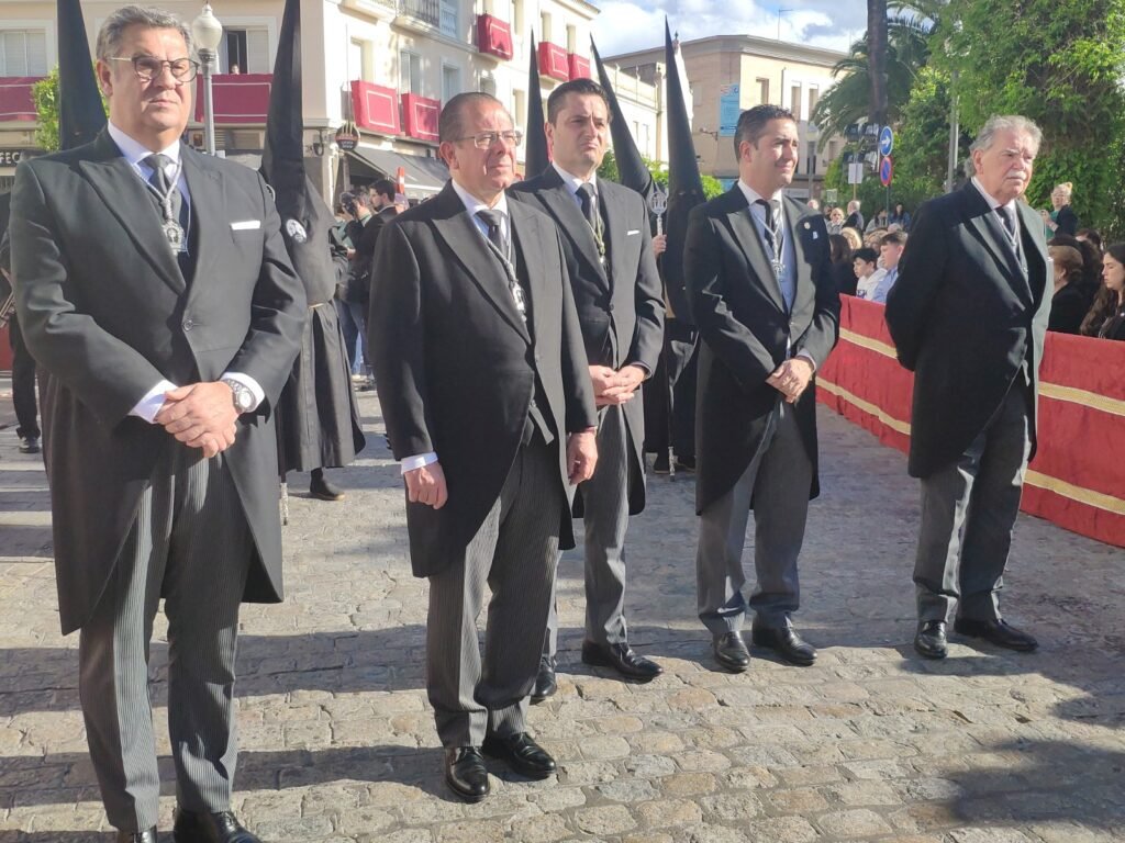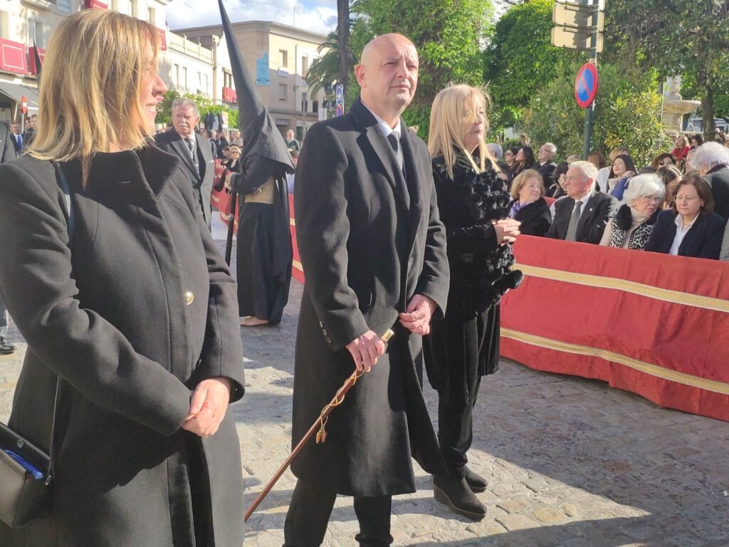 Antes del paso de la urna del Santo Cristo Yacente, se incorporan al cortejo las autoridades civiles, con representación de la Policía Local, Policía Nacional y Guardia Civil, así como de la corporación municipal, presedida por el alcalde de la ciudad, Paco Rodríguez. Le seguían, cerrando este tramo institucional, la junta superior del Consejo de Hermandades y Cofradías, con su presidente, Fran Alba Claro, en el centro.