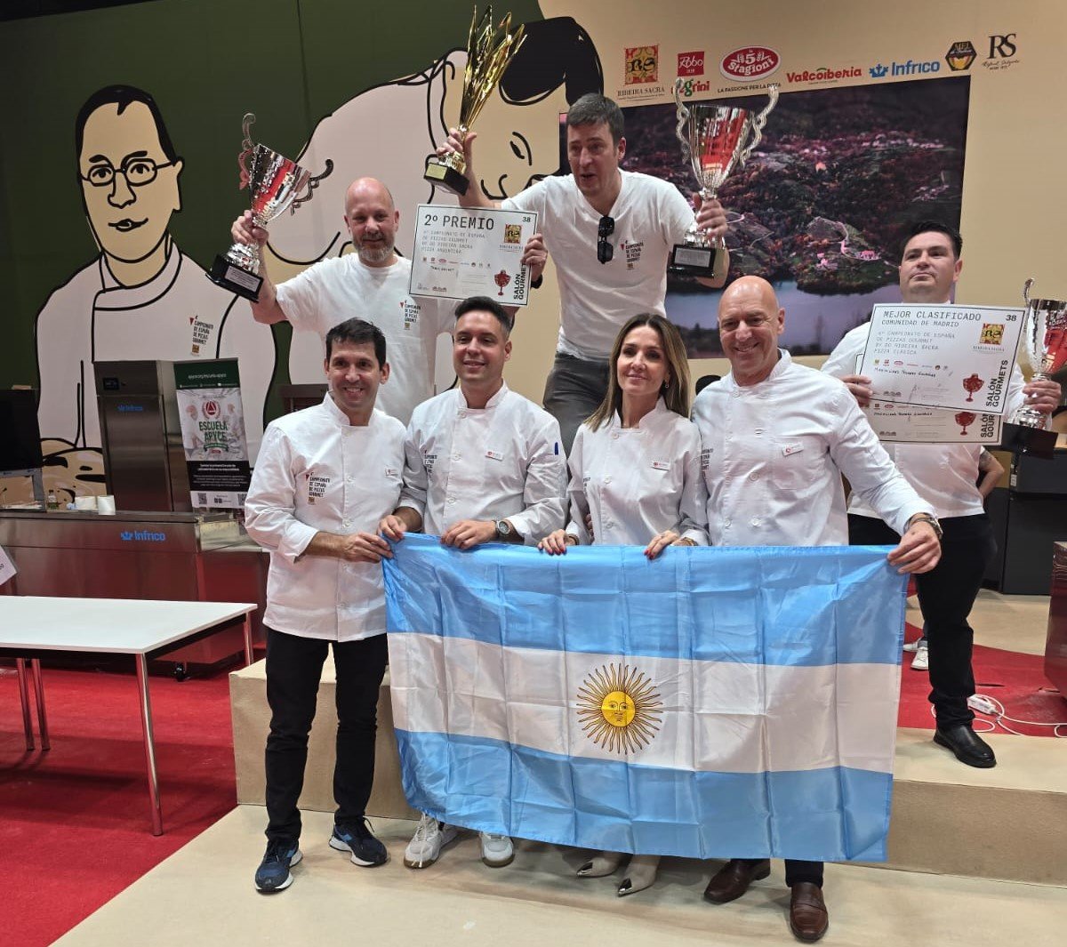 El podio lo completaron tres argentinos emigrados, que actualmente trabajan en España. El primer puesto quedó en manos de Luciano Grigolato, natural de Cutral Co (Neuquén), que reside en España desde hace 20 años y triunfa en Málaga; Pablo Gouget, que llegó limpiando cristales y es dueño de una de las mejores pizzerías de Sevilla, en Dos Hermanas; y Maximiliano Romero, de Banfield, lleva dos décadas cocinando en Madrid.