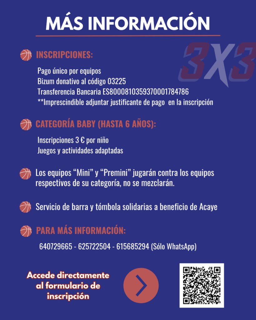 La inscripción tiene un coste variable según categoría y se realiza de forma grupal por equipo. El pago puede efectuarse mediante Bizum al código 03225 o por transferencia bancaria a Acaye ES8000810359370001784786. Los interesados en participar pueden hacerlo a través del formulario web habilitado para ello.