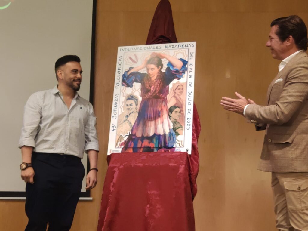 El artista nazareno Diego Gómez Sánchez repite diez años después realizando el cartel anunciador de las 43º Jornadas Folcóricas Nazarenas Internacionales. Como novedad, el cartelista ha creado una versión animada, una obra viva y en movimiento, para las redes sociales y con la que poder acercarse a un público más joven.
