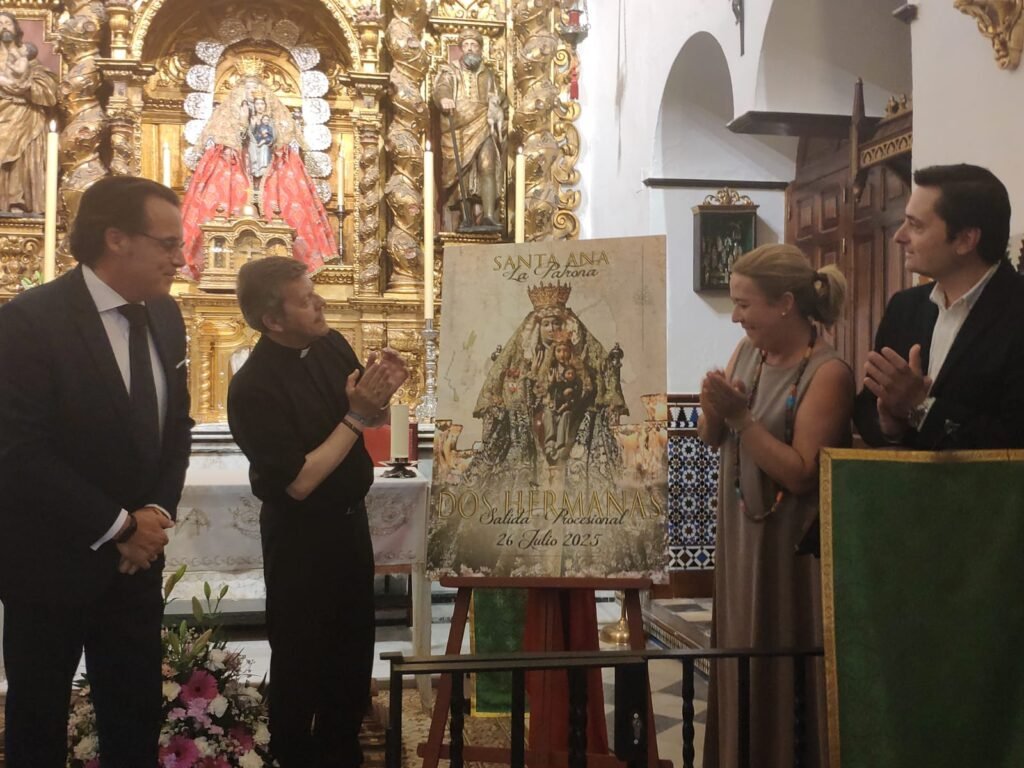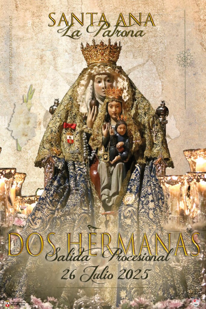 En la parte alta de la imagen aparece el lema ‘Santa Ana. La Patrona’, algo en lo que quería insistir el autor del cartel para resaltar la importancia de esta imagen en la historia y la actualidad de la ciudad. En la parte baja aparece otro rótulo en dos colores con ‘Dos Hermanas’, por una parte, y ‘Salida Procesional 26 de julio 2025’, por otra.