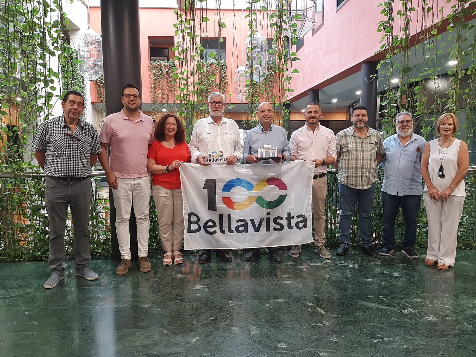 El encuentro ha concluido con la entrega al alcalde de una réplica de la portada de la Hacienda de Doña María —lugar de gran simbolismo para ambos municipios— así como de una reproducción del logotipo oficial del Centenario de Bellavista.