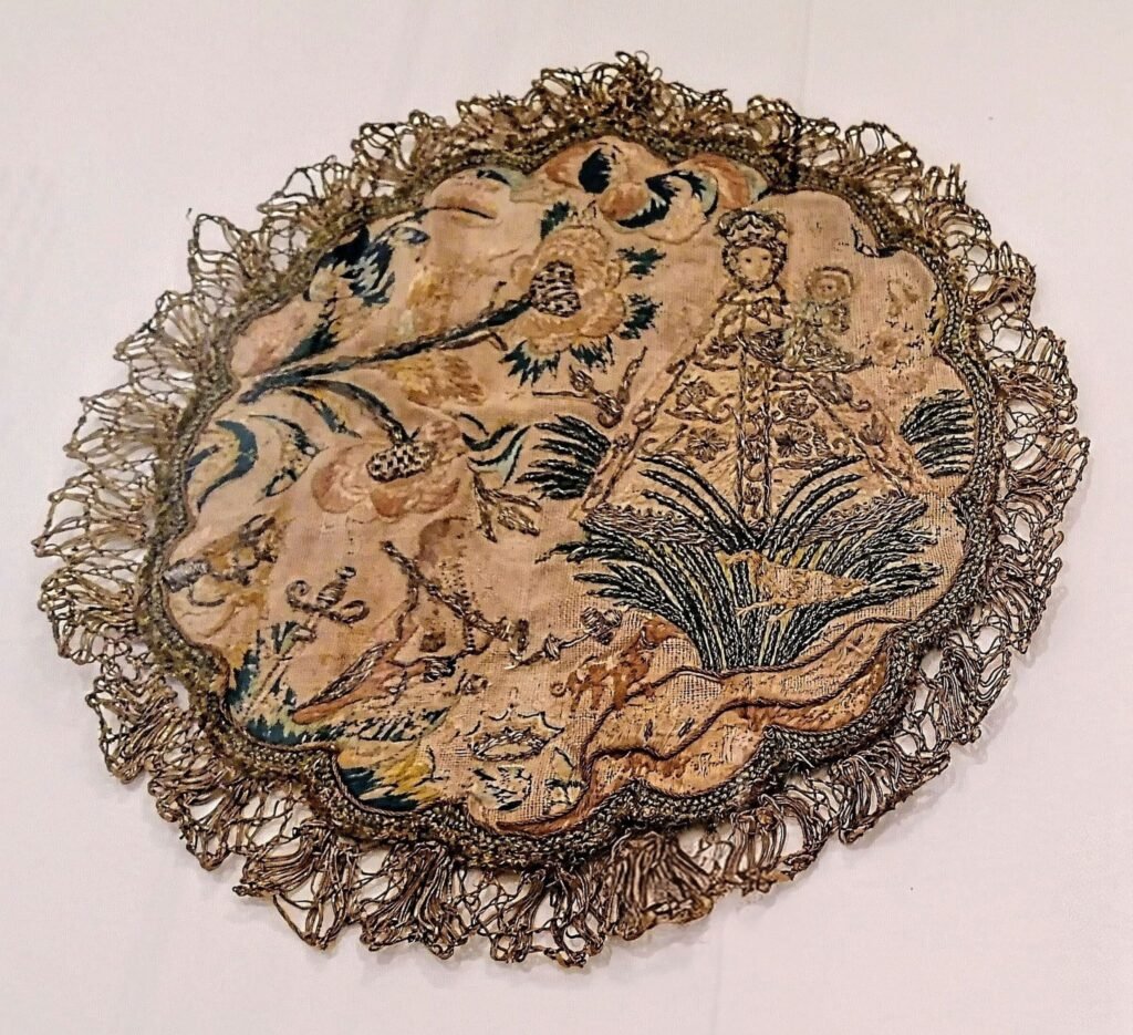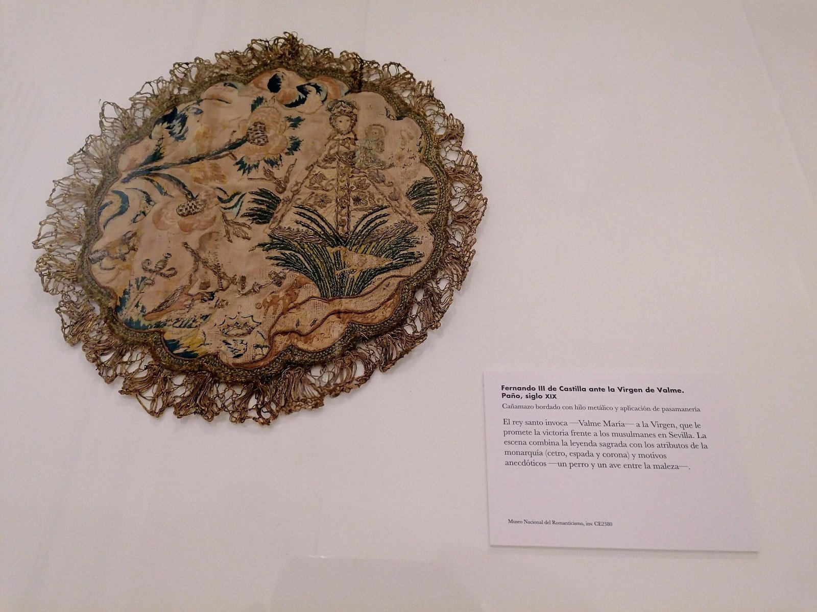 El rey santo invoca –Valme María– a la Virgen, que le promete la victoria frente a los musulmanes en Sevilla”. Así comienza la descripción de la cartela que acompaña al paño expuesto, posiblemente realizado por alguna joven de la alta burguesía madrileña del siglo XIX que se iniciaba en las labores del bordado y que, a buen seguro, conocería la historia de la Virgen de Valme gracias a los escritos coetáneos de Cecilia Böhl de Faber (Fernán Caballero).