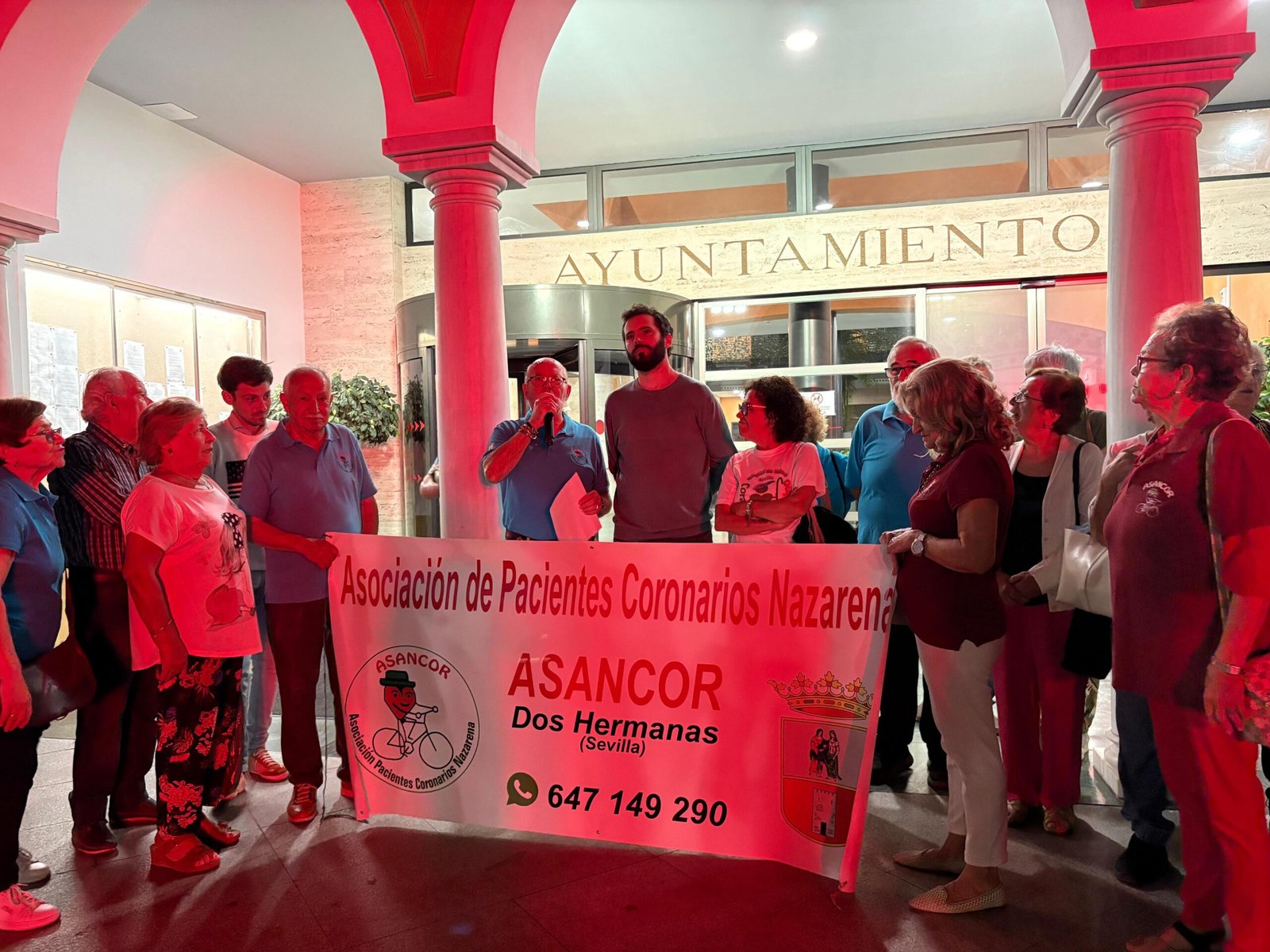 Como acto central de la jornada de este lunes, día 29, la fachada del Ayuntamiento se iluminó de rojo, símbolo de la lucha contra las enfermedades del corazón, y se procedió a la lectura de un manifiesto por parte del Presidente de Asancor, Antonio Cabrera Salguero, que con el lema Muévete por tu corazón, se ha centrado este año en la importancia de la actividad física y los hábitos saludables para la salud cardiovascular. En este acto se contó con la presencia del Teniente Alcalde delegado de Cohesión Social, Juan Pedro Rodríguez García, quien destacó el compromiso del consistorio en la puesta en marcha de políticas y acciones que fomenten hábitos de vida saludables.