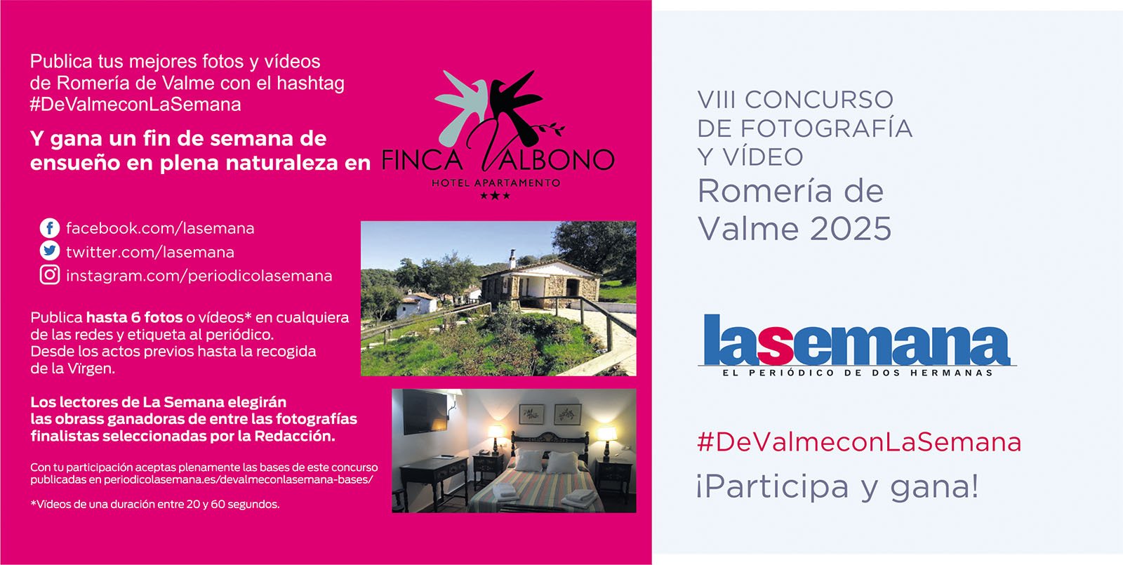Entre todas las imágenes y vídeos presentados, el equipo de La Semana publicará en sus redes sociales las finalistas para que los lectores nos den su opinión con sus ‘Me gusta’ y así poder elegir al ganador. El premio será un fin de semana en el Hotel Finca Balbono de Aracena.