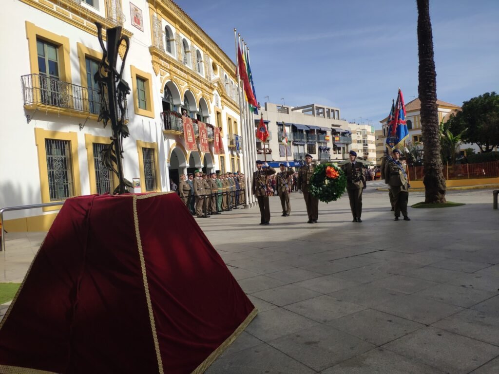 La parada militar prosiguió con un homenaje a los caídos, en el que la corona de laurel fue depositada por dos representantes de la sociedad nazarena. Por una parte, Francisco Alba Claro, presidente del Consejo de Hermandades y Cofradías de Dos Hermanas, y Carmen Romero Dorado, secretaria de la junta local de la Asociación Española contra el Cáncer. Este momento culminó con una salva de fusilería con disparos al aire.