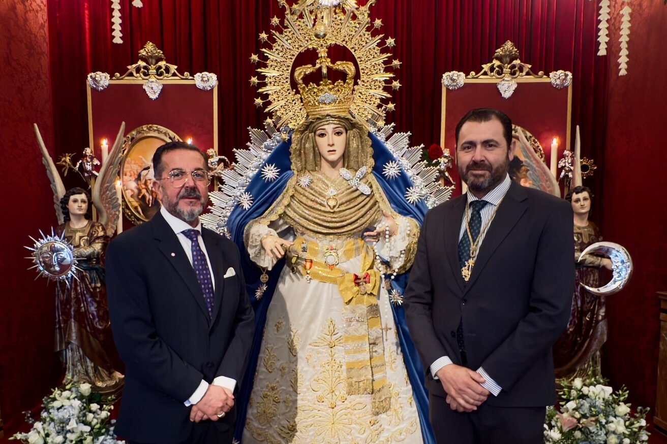 La Virgen, en el centro de la composición, se presentaba vestida de blanco (pureza) y azul (realeza) identificándola con su Pura y Limpia Concepción. Coronada sobre sus sienes por doce estrellas, enmarca su silueta una ráfaga de hombros de la Hermandad de Oración en el Huerto, referenciando al pasaje del que habla San Juan en su libro del Apocalipsis, lectura que se da en la solemnidad del día 15 de agosto, Festividad de la Asunción de la Virgen María.