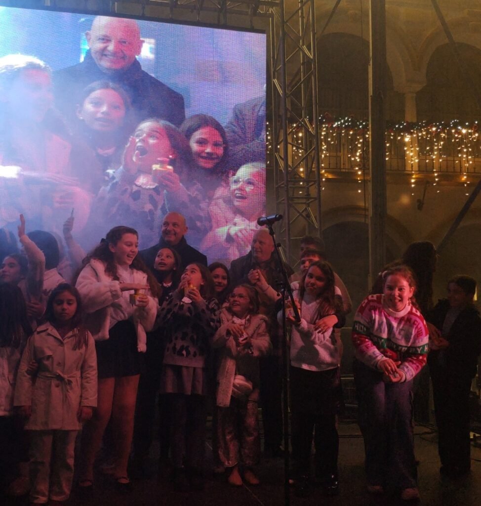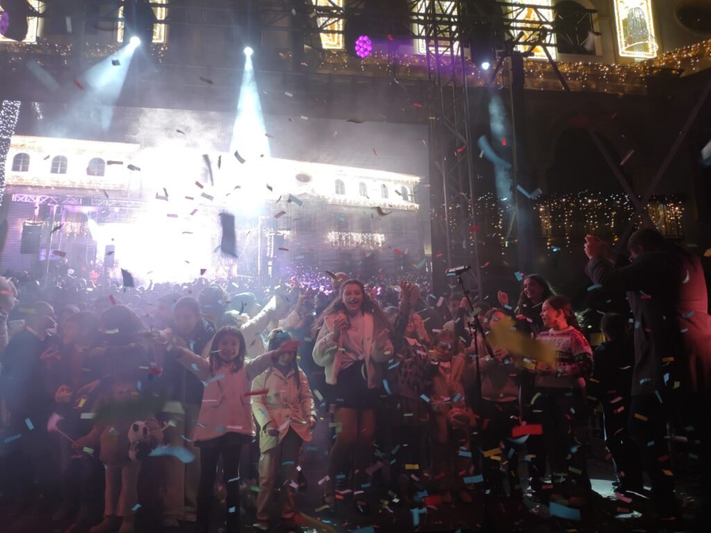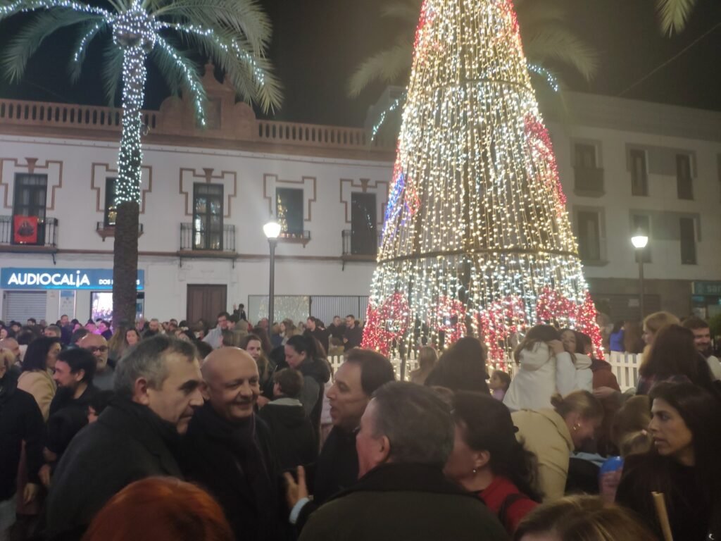 Y antes de que la ciudad se iluminase, fue un Dj el encargado de pinchar grandes éxitos de la discografía navideña ante una Plaza de la Constitución repleta de público. Cuando faltaban pocos minutos para las siete de la tarde, un grupo de niños y niñas subieron al escenario para accionar el alumbrado. Estuvieron acompañados por Naco, la mascota de Fenaco, además de por el alcalde de la ciudad, Paco Rodríguez, y del presidente de la Federación Nazarena de Comerciantas, José Manuel Cordero. Una lluvia de confetis inundó de color el momento en el que la fachada del Ayuntamiento y la Plaza de la Constitución se alumbraron para la Navidad en Dos Hermanas.