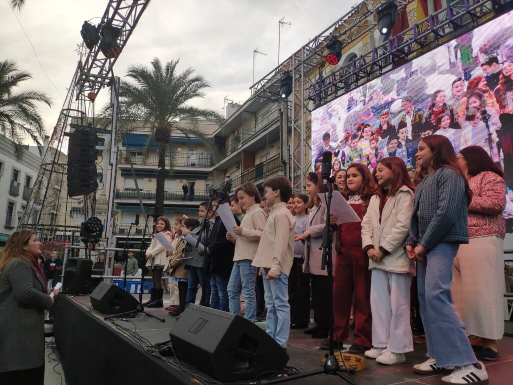 En el escenario principal, instalado en la puerta del Ayuntamiento, actuaron en las primeras horas de la tarde varios coros infantiles de la ciudad. Se subieron al escenario para animar con sus sones el Coro de Campanilleros de la Borriquita, Coro Arcoiris, el del CEIP Maestro Enrique Díaz Ferreras, Coro Infantil de la Hermandad de Valme y de la Escuela Privada de Danza y Música Nuestra Señora de la Compasión.