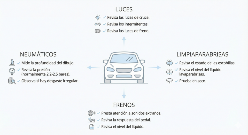 Antes de iniciar cualquier trayecto, conviene dedicar unos minutos a una revisión visual del vehículo. Comprobar que todas las luces funcionan correctamente, verificar la presión de los neumáticos y asegurarse de que los limpiaparabrisas limpian sin dejar rastros son acciones rápidas que aumentan la seguridad.