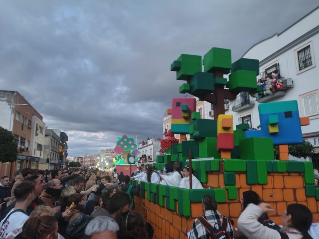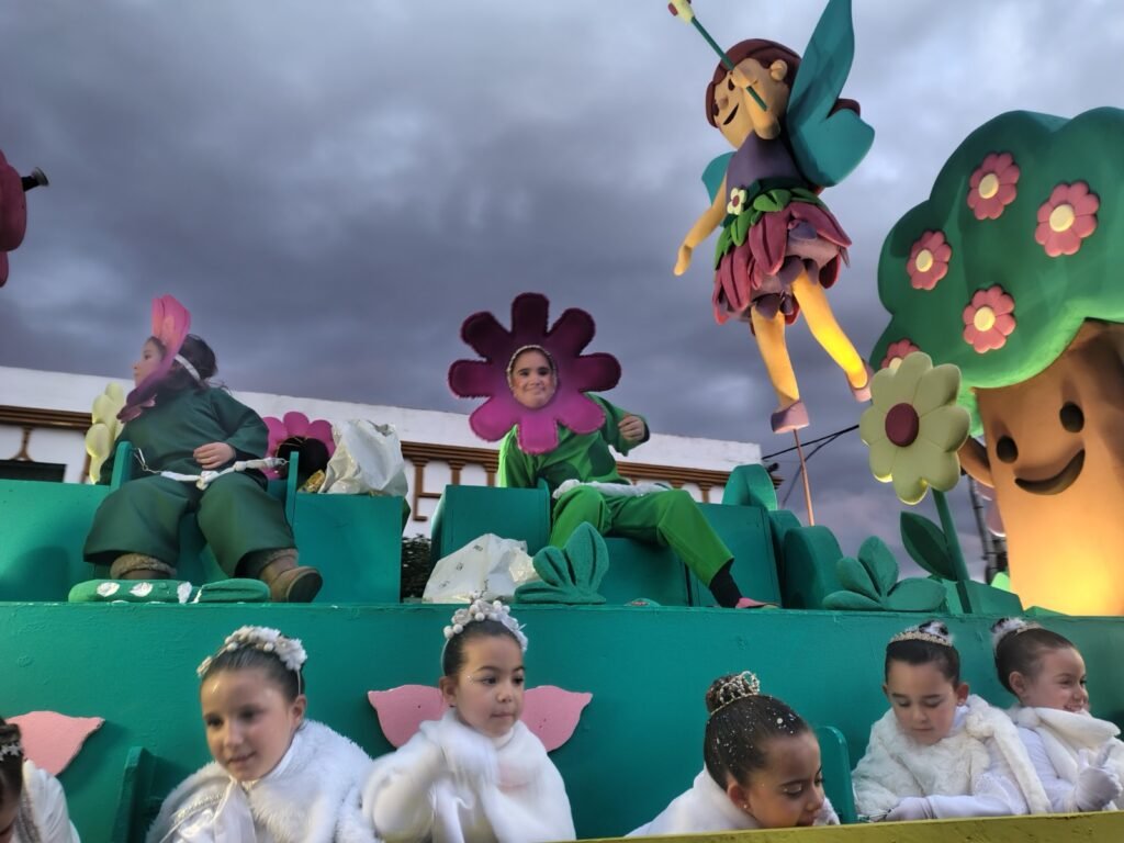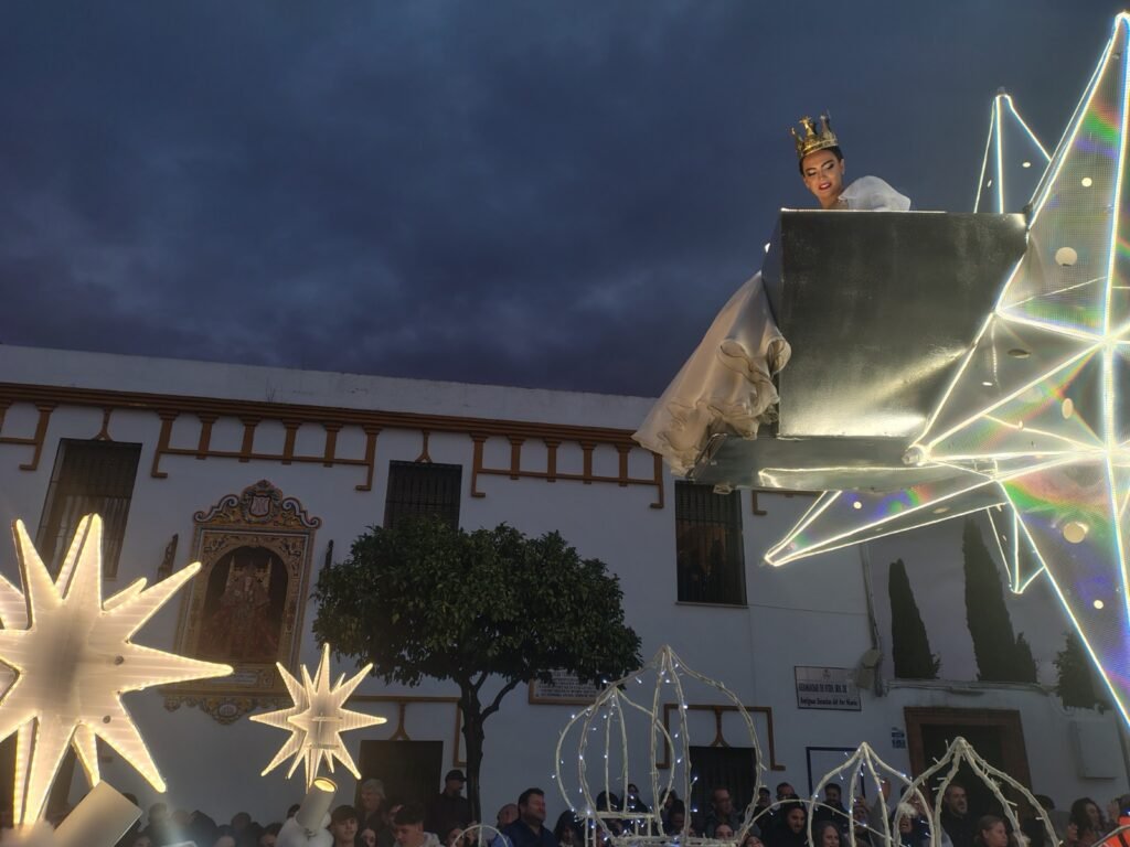 Todo estaba listo. El público esperando en las inmediaciones de la calle Arroz. Los beduinos aguardando su momento para sumarse al cortejo y la Banda de Santa Ana, que abría la comitiva afinando para comenzar a tocar. A las 16:15 horas, la carroza de la Estrella de la Ilusión salía a la calle para ir abriendo camino, pero, para sorpresa de los presentes, dio marcha atrás y volvió a entrar en la nave. Negras nubes amenazaban por la calle Manuel de Falla o El Ejido y llegaban noticias de que estaba lloviendo en Sevilla y algunos pueblos del Aljarafe. La organización decidió esperar, al contar con más margen desde que el pasado 2025 se decidiera adelantar la salida, a que pasaran esas nubes, ya que las predicciones aseguraban que, una vez la Borrasca Francis hiciera acto de presencia, no habría más agua en el resto de la tarde.