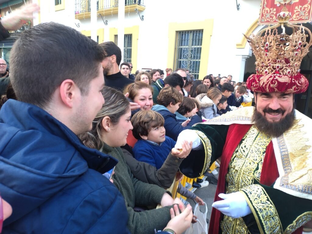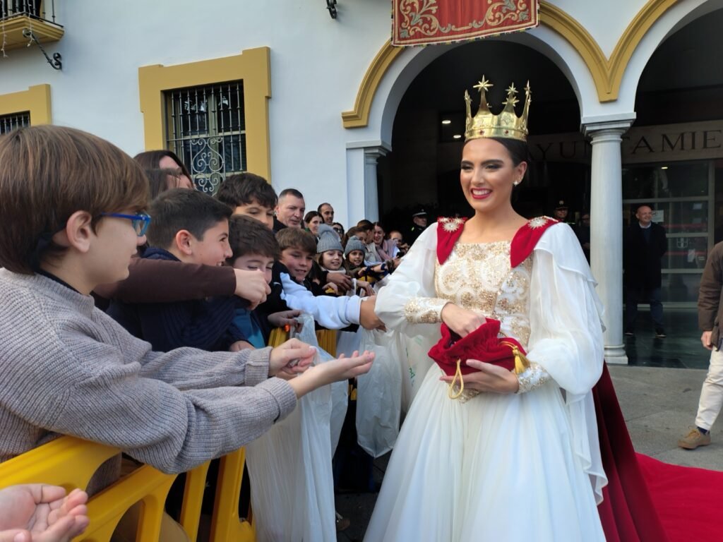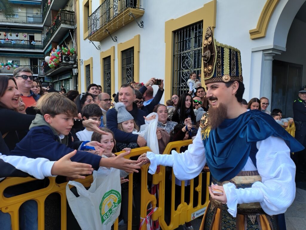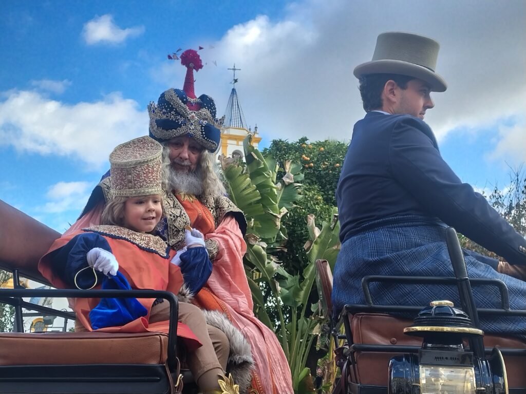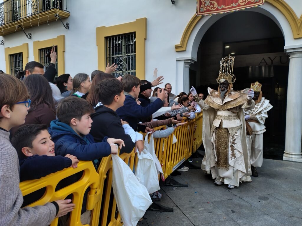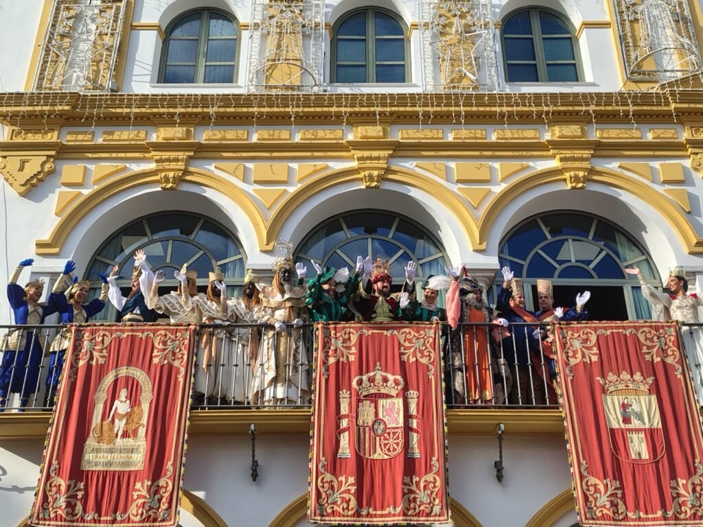 El azul del cielo competía con el dinámico cromatismo del atuendo de los más de 600 beduinos del cortejo y que ya tomaban Los Jardines para acompañar a los personajes de la cabalgata en su camino a la nave de la fantasía, en la calle Arroz. A las tres y media en punto, las cristaleras del balcón central de la casa consistorial se abría y aparecían Melchor, Gaspar y Baltasar, acompañados, en un principio, por la Estrella de la Ilusión y el Cartero Real. La Banda de Música de Dos Hermanas Santa Ana interpretó el Himno de Andalucía y el de España, antes de animar el ambiente de la plaza con los sones del villancico Ya vienen los Reyes Magos, que el público allí congregado coreó mientras miraban ilusionados al balcón, donde los personajes de la cabalgata saludaban, ya acompañados por sus respectivos séquitos.