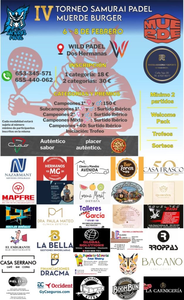 El equipo Samurai Pádel está organizando la cuarta edición del Torneo Samurai Pádel Muerde Burger, que ha convertido en una de las “competiciones más atractivas” que se organizan en la provincia de Sevilla. Este torneo tendrá lugar del día 6 al 8 de febrero en las instalaciones de Wild Pádel en Dos Hermanas.