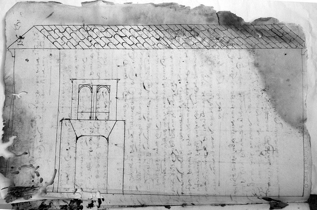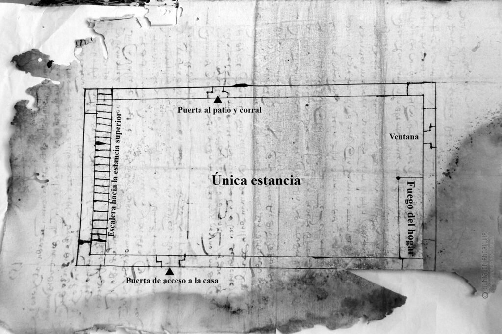 Para la techumbre (en este caso a dos aguas), se colocaron vigas de madera, poniéndose tejas árabes en el exterior. Y en cuanto al exterior, la única decoración se concentraba en la puerta principal, realizada en este caso en piedra (aunque se podía construir en ladrillo), y compuesta por un arco carpanel (muy popular en el XVI). Sobre el citado arco se abría una ventana geminada o ajimez, única apertura que daba luz a la estancia superior. El pilar central que sostendría los arcos de medio punto del ajimez, sería, según se apunta en el referido documento, preferiblemente de mármol o, en su defecto, de ladrillo. La casa contaba, asimismo, con patio y corral.