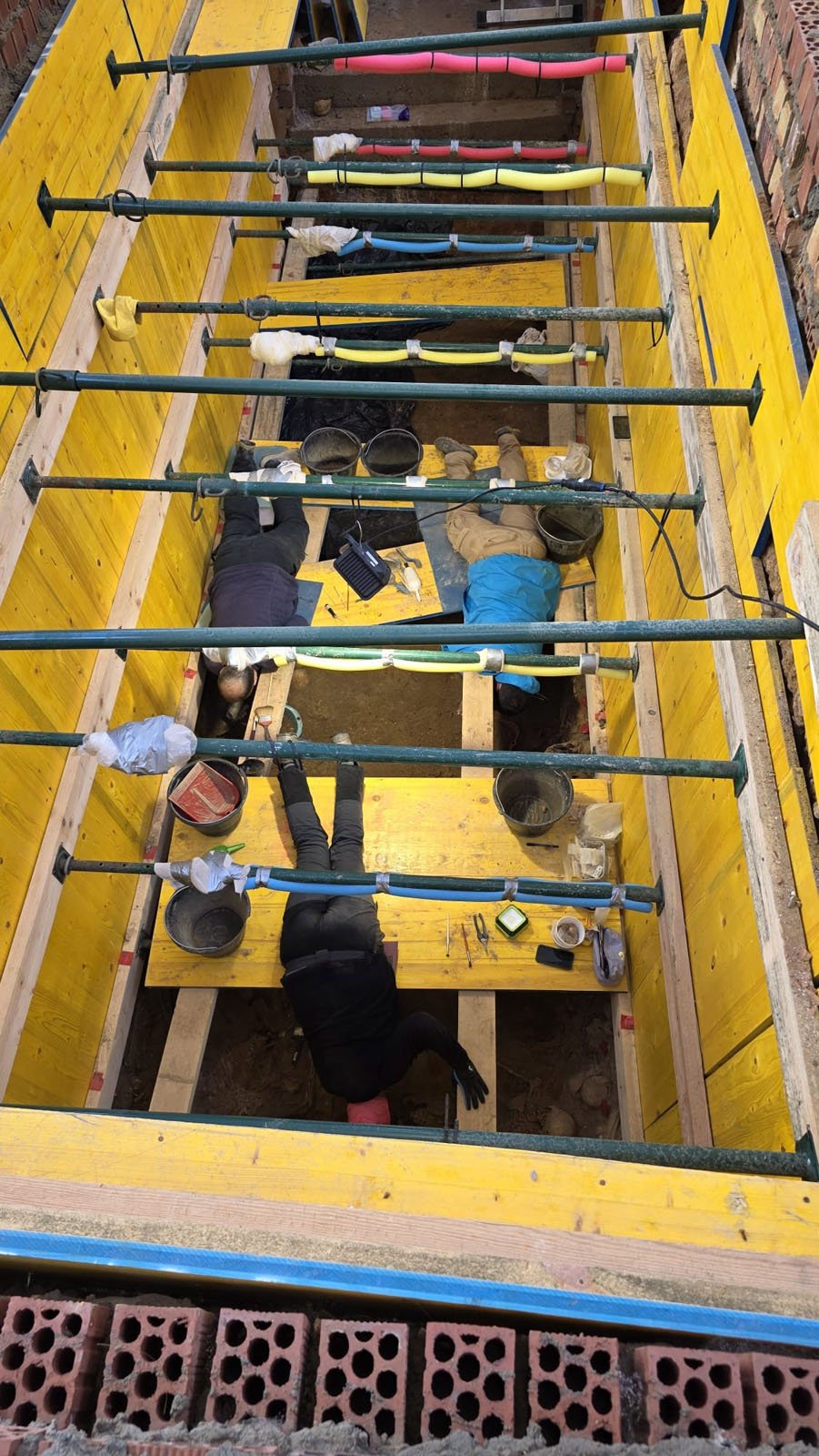 Para llegar a este nivel de la fosa, el equipo multidisciplinar ha tenido que intervenir previamente sobre capas superiores de entierros de beneficencia, donde se localizaron y documentaron restos de 40 adultos y 60 niños, niñas y bebés, cuyos familiares no tenían recursos para enterrarlos en nichos o tumbas.