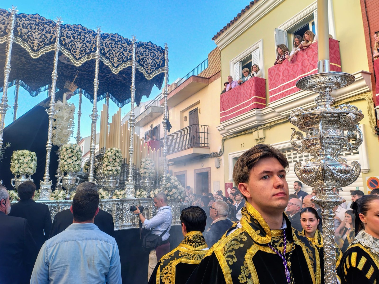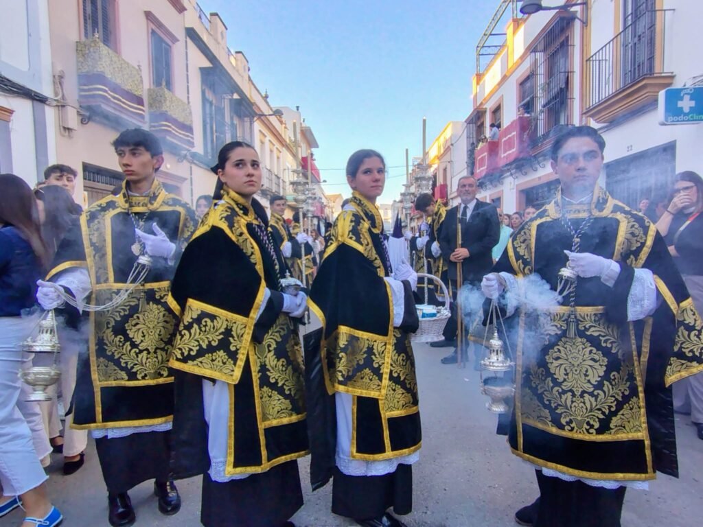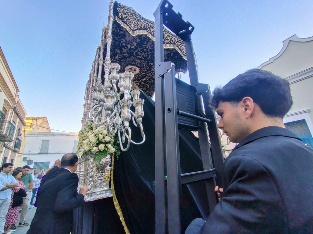 Y delante del paso de misterio, aunque ya es un habitual, la reciente medalla de oro de la ciudad de Dos Hermanas, el humorista Manu Sánchez, en su papel de pertiguero. Medalla que, en este Miércoles Santo, lució Ntra. Madre y Señora de los Dolores en su salida procesional. La Dolorosa salía por primera vez tras la restauración a la que fue sometida en el taller de Laura Pérez Meléndez, además de lucir la corona restaurada en el Taller de orfebrería Juan Lozano.