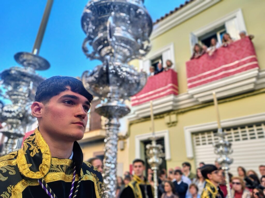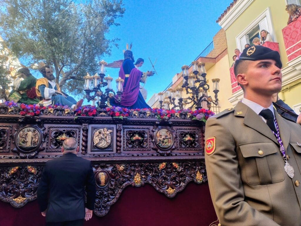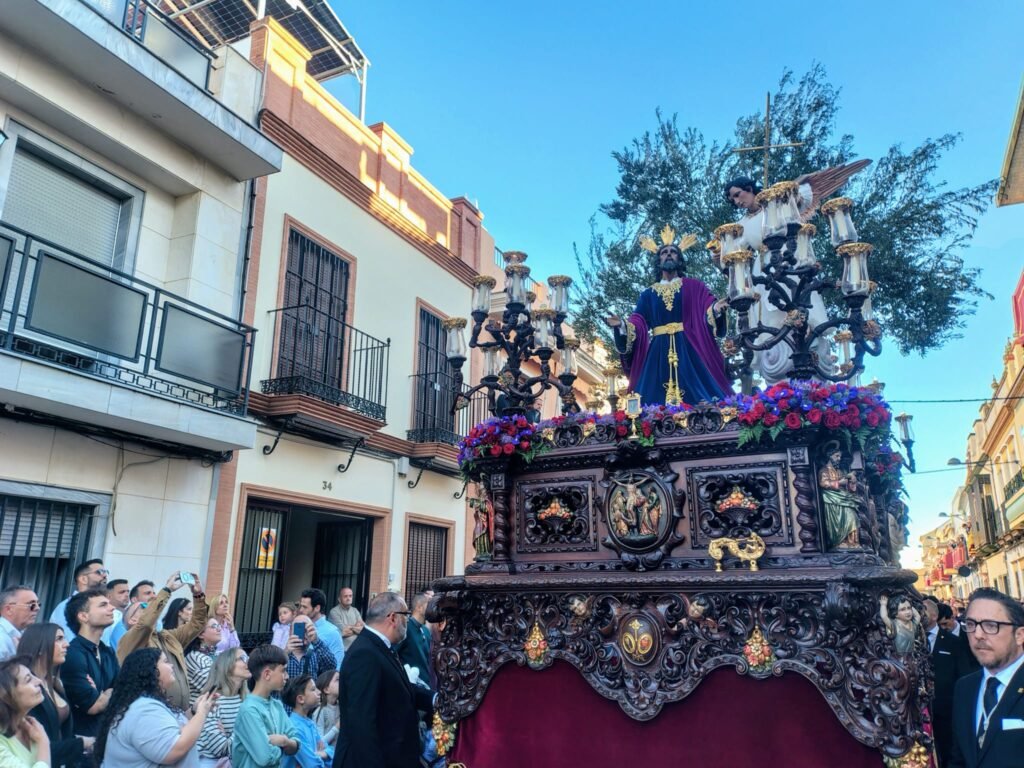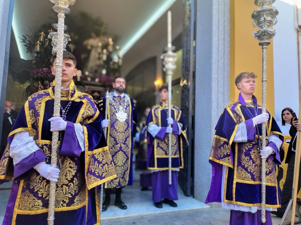 El Cristo de Manuel Pineda Calderón lució túnica azul y manto morado. A sus plantas, el exorno floral se convirtió en oración: los iris morados evocaban el dolor, mientras el allium simbolizaba la eternidad. Las rosas freedom y el clavel rojo representaban el amor y el sacrificio; el eryngium, la dureza de la Pasión; y el helecho, la esperanza. Como detalle singular, un jilguero había hecho su nido en el olivo, imagen viva de la creación que acompaña al Señor.
