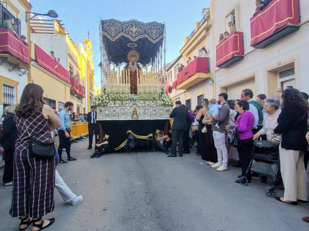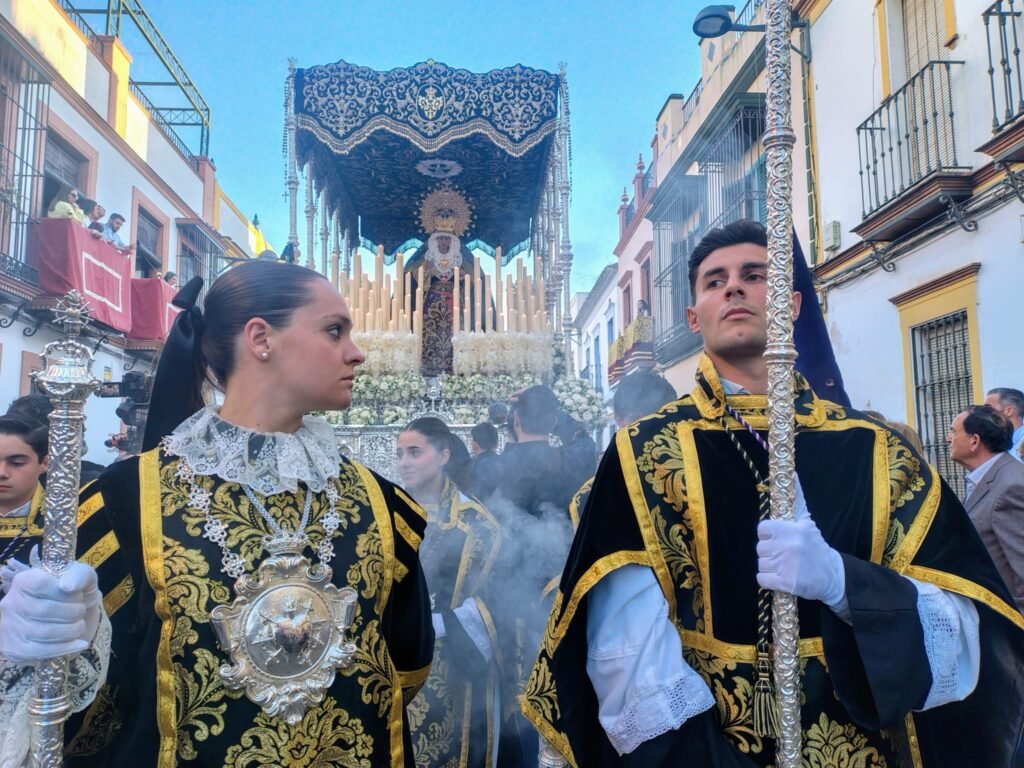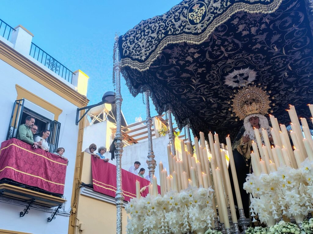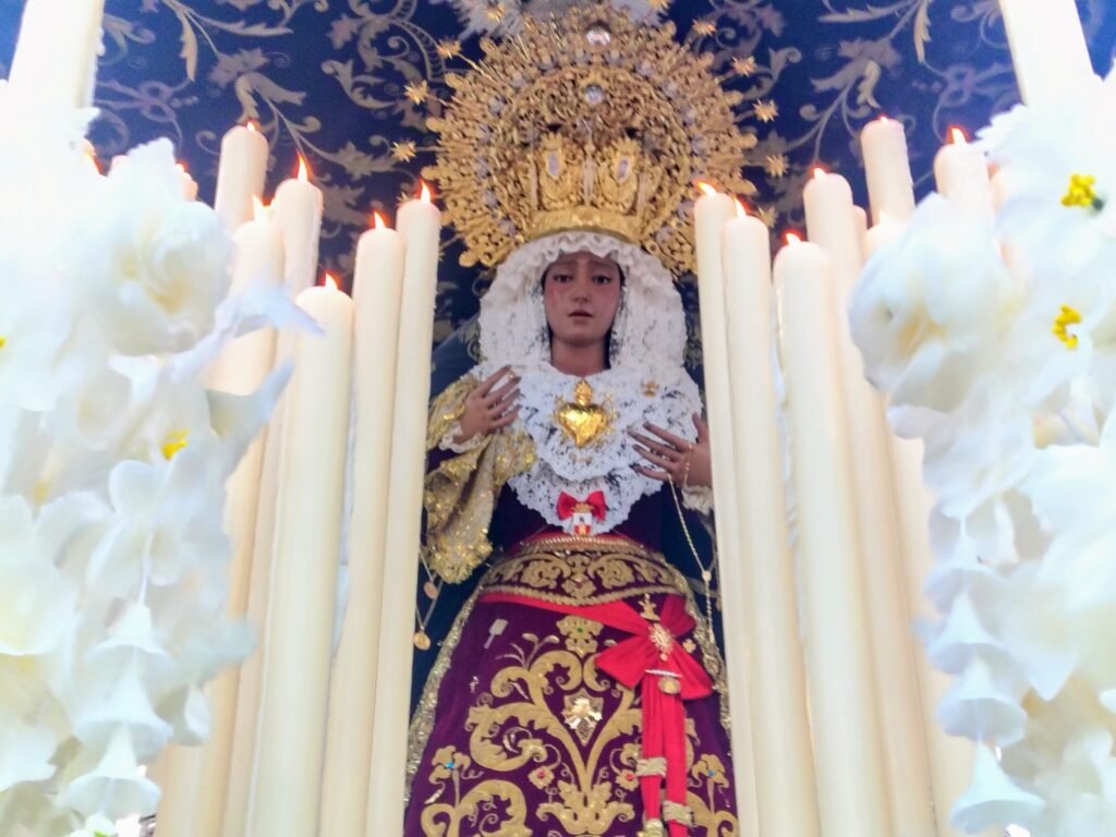 El exorno floral del palio se elevaba como delicada plegaria. Las diferentes rosas, en su pureza y elegancia, evocaban la ternura y la gracia de la Virgen. La flor de cera simboliza la fidelidad que perdura, mientras el hypericum blanco anuncia la luz y la esperanza que nacen de su amor. Así, en la suavidad de cada flor, se refleja la dulzura y el consuelo de la Madre.