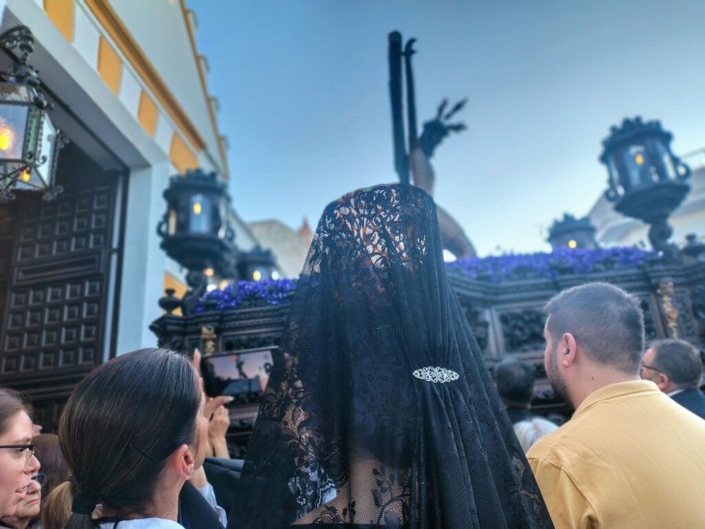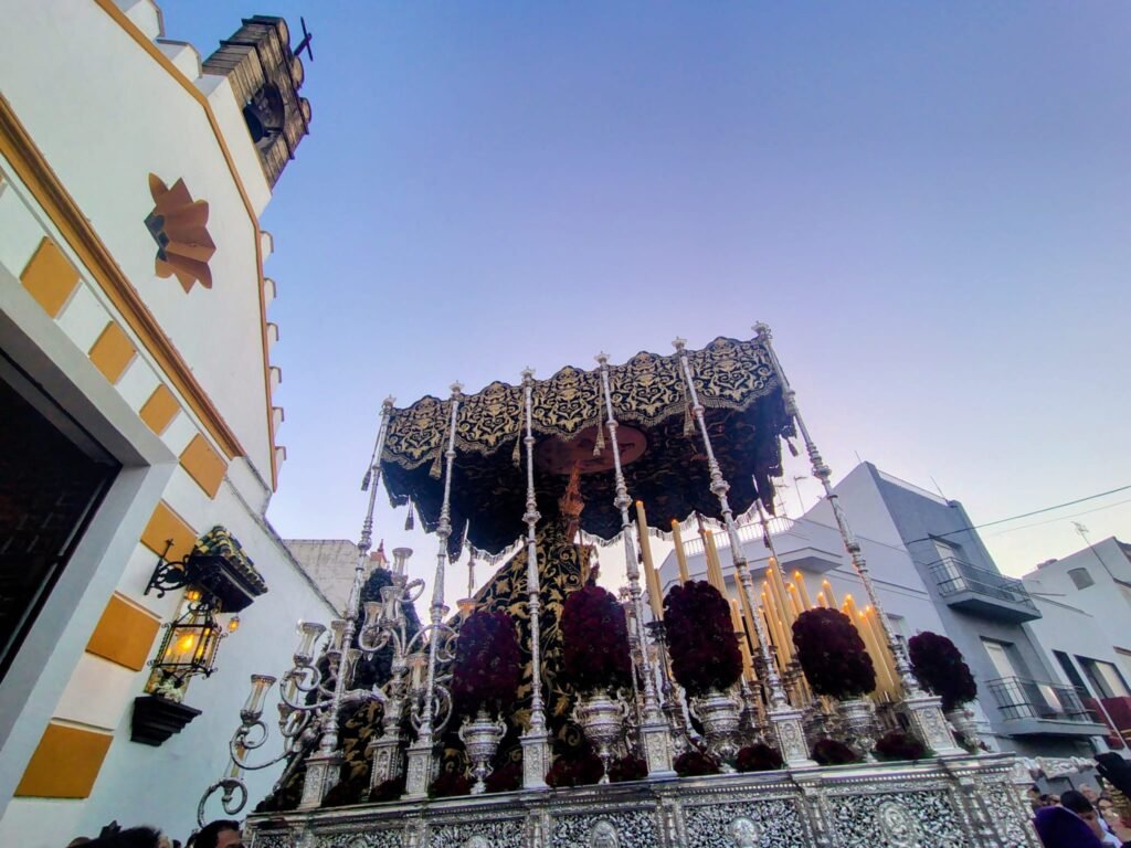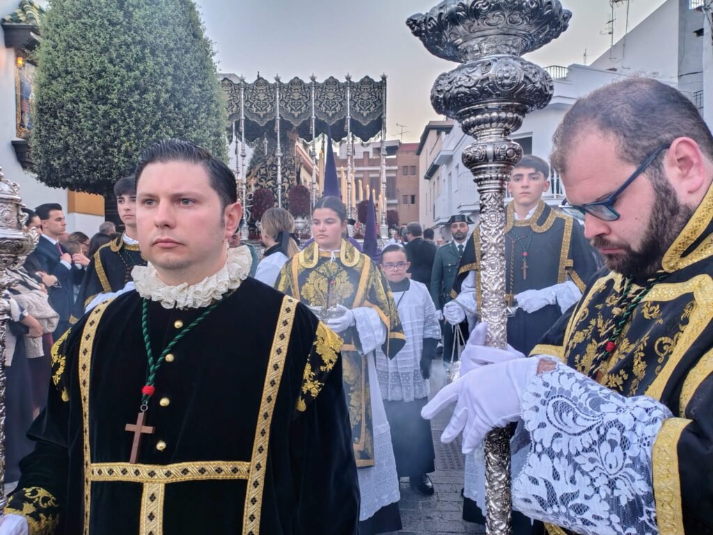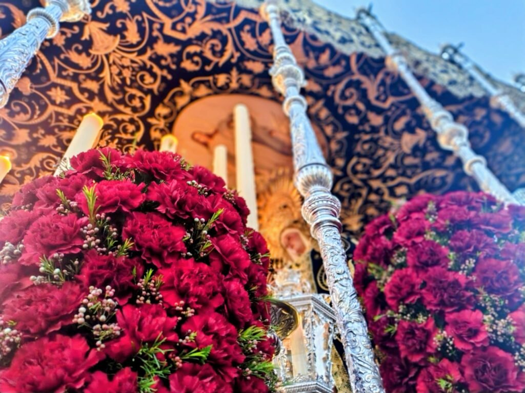 Uno de los grandes focos de atención de la jornada fue el exorno floral del paso de palio. Rompiendo con la tradición de los claveles blancos, la Virgen del Mayor Dolor lució este año claveles rojos, ofreciendo una imagen inusual y de gran potencia visual bajo las primeras sombras de la noche.