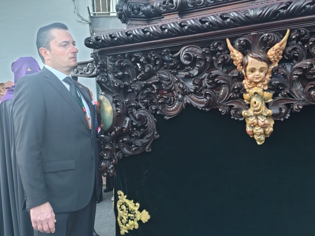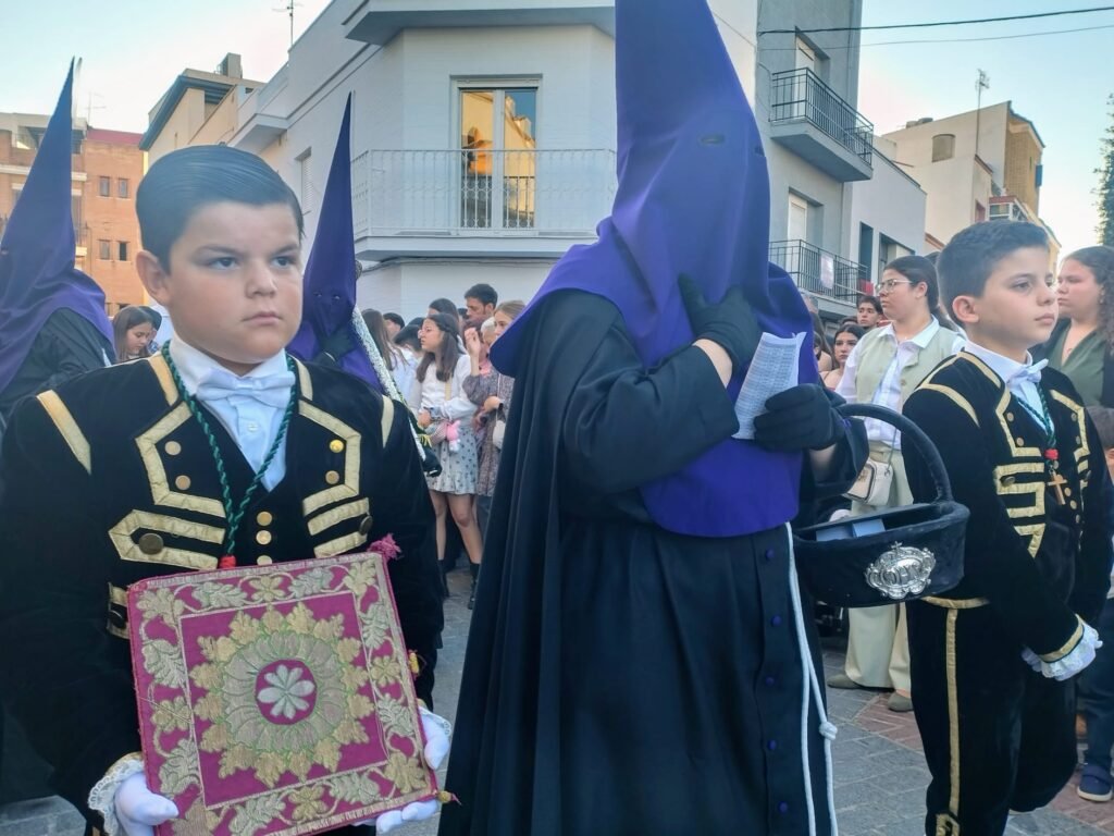 El cortejo, de un rigor absoluto, destacó por su solemnidad. Los nazarenos, con túnica y capa negra y antifaz morado, custodiaron elementos de incalculable valor, como la reliquia del Lignum Crucis —un ostensorio que porta una astilla de la verdadera cruz— y el singular cortejo de disciplinas con sus vástagos y flagelos de cuero rematados en abrojos de metal.
