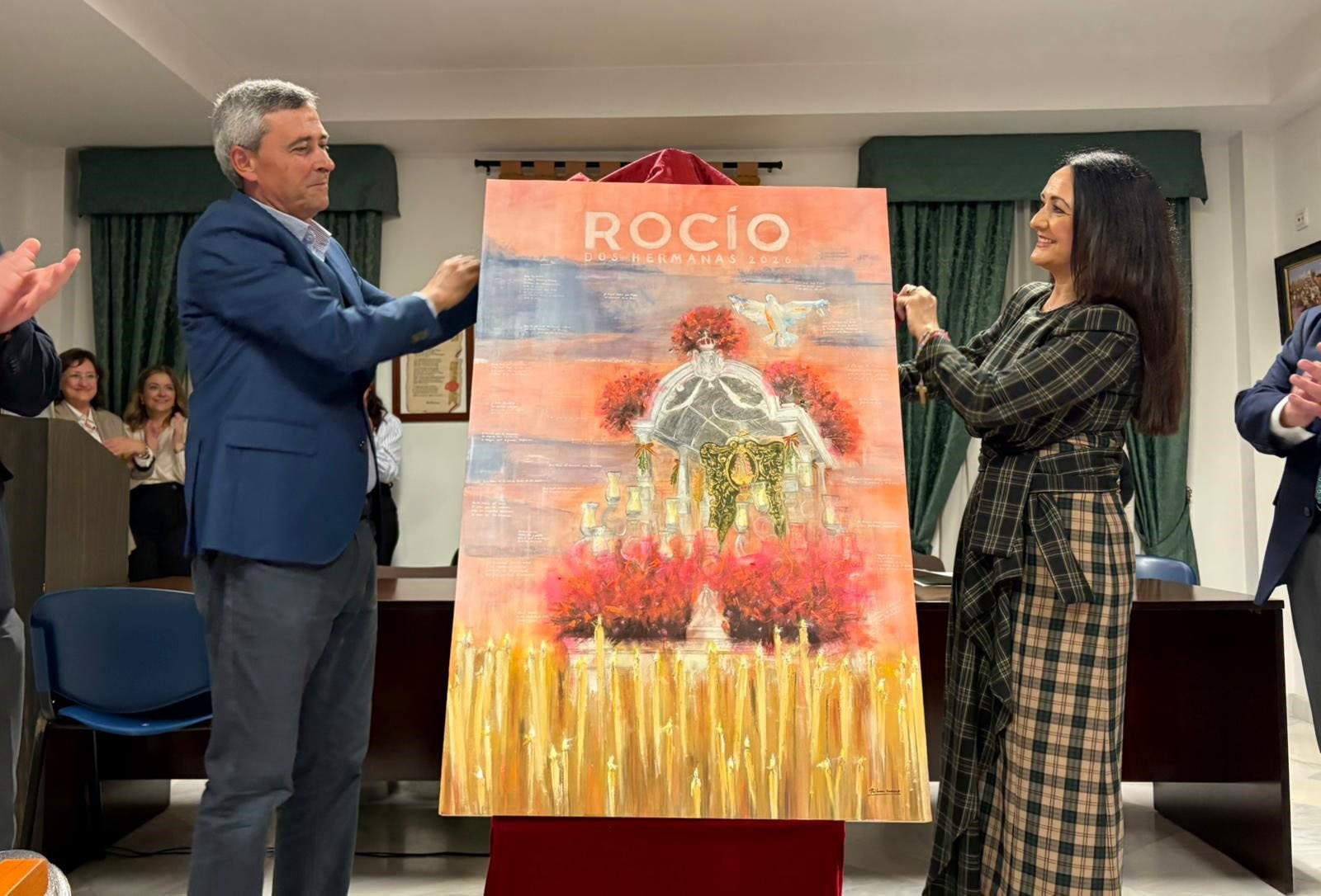 La casa hermandad de la calle Alcoba acogió el pasado viernes por la noche la presentación del cartel anunciador de la romería que ha realizado la artista nazarena Paloma Romero Serrallé. La obra lleva por título Ya viene Dos Hermanas… Un camino de fe y ha sido realizada sobre una tabla de 1,20 x 80 sobre papel encolado. La técnica es mixta con acuarela, pastel y acrílico. El cartel recoge una imagen frontal de la carreta del Simpecado de Dos Hermanas en una de sus paradas, con un frontal de velas y una paloma blanca sobrevolando la estampa.