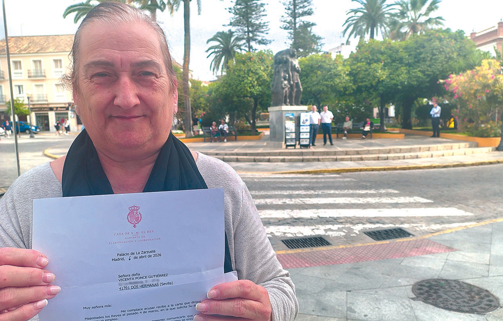 Vicenta sabía que el Rey no iba a contratarla, pero era más una necesidad de sentirse escuchada e intentar que alguien pudiera echarle una mano. Con esa intención, la mañana de la visita se posicionó en la confluencia de la calle Nuestra Señora de Valme con la Plaza de la Constitución. No estaba en primera fila, estaba entre la multitud, pero cuando el monarca se acercó a saludar al público “me dio una mano y, con la otra, le entregué la carta”. Ella vio cómo Felipe se la pasó a personal de su equipo, “que la guardaba en su maletín”, lo que no sabía era que un mes y diez días después iba a recibir una respuesta.
